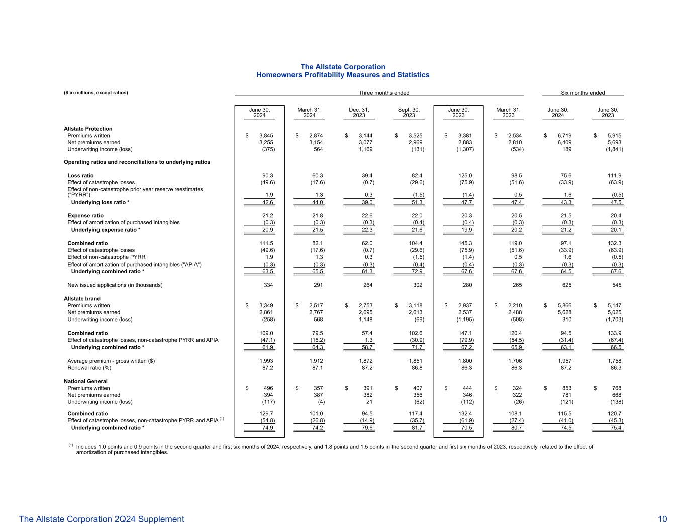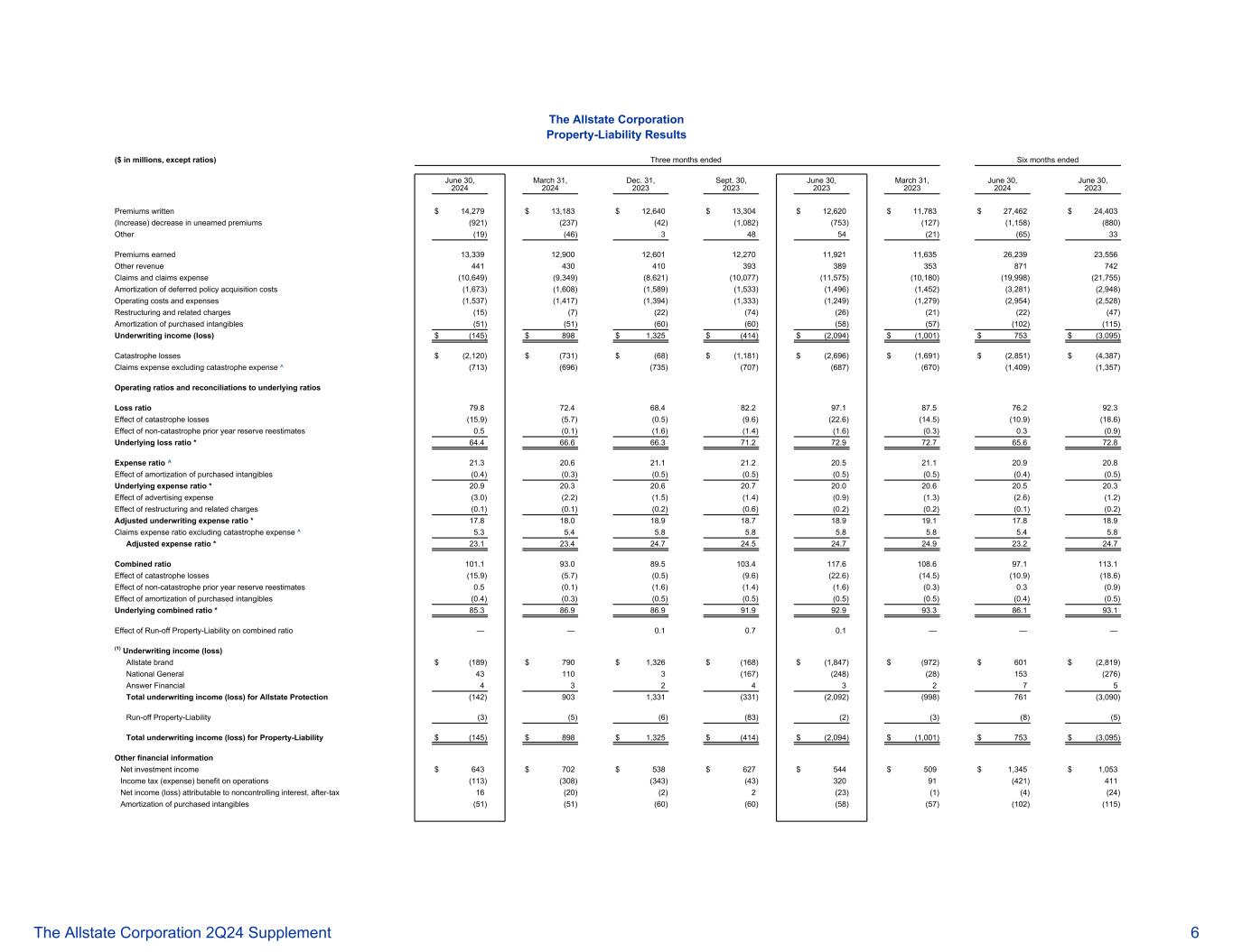 好事达保险公司房主盈利能力衡量和统计数据(百万美元,比率除外)截至2024年6月30日止六个月的三个月2024年3月31日2023年12月31日2023年9月30日2023年6月30日2023年3月31日2024年6月30日,2023年度好事达保险保护保费承保$ 3,845 $ 2,874 $ 3,144 $ 3,525 $ 3,381 $ 2,534 $ 6,719 $ 5,915净赚保费3,2553,1543,0772,9692,8832,8106,4095,693承保收入(亏损)(375)5641,169(131)(1,307)(534)189(1,841)营业比率与基础比率的对账损失率90.36 0.33 9.48 2.41 25.098.575.61 11.9巨灾损失的影响(49.6)(17.6)(0.7)(29.6)(75.9)(51.6)(33.9)(63.9)非巨灾上一年准备金重估的影响(“PYRR”)1.9 1.3 0.3(1.5)(1.4)0.5 1.6(0.5)基础损失率* 42.64 4.03 9.05 1.347.74 3.34 7.5费用率21.22 1.82 2.62 2.02 0.32 0.52 0.52 1.52 0.4外购无形资产摊销的影响(0.3)(0.3)(0.3)(0.4)(0.3)(0.3)基础费用率* 20.92 1.52 2.32 1.6 19.92 0.22 1.22 0.1综合比率111.58 2.16 2.0 104.41 45.3132.3巨灾损失的影响(49.6)(17.6)(0.7)(29.6)(75.9)(51.6)(33.9)(63.9)非巨灾PYR1.9 1.3 0.3(1.5)(1.4)0.5 1.6(13)外购无形资产摊销的影响(“APIA”)(0.3)(0.3)(0.3)(0.3)(0.4)(0.3)(0.3)(0.3)基础合并比率* 63.565.56 1.37 2.96 7.66 7.66 4.56 7.6新发申请(单位:千)334291264302280265625545 好事达保险品牌保费写入$ 3,349 $ 2,517 $ 2,753 $ 3,118 $ 2,937 $ 2,210 $ 5,866 $ 5,147已赚净保费2,8612,7672,6952,6132,(258)5681,148(69)(1,195)(508)310(1,703)综合比率109.07 9.557.4 102.61 47.11 20.49 4.51 33.9巨灾损失的影响,非巨灾PYRR和APIA(47.1)(15.2)1.3(30.9)(79.9)(54.5)(31.4)(67.4)基础综合比率* 61.96 4.358.77 1.76 7.265.96 3.166.5平均保费-毛承保(美元)1,9931,9121,8721,8511,8001,7061,9571,758续保比率(%)87.28 7.18 7.286.386.387.286.387.286.3全国一般保费承保496美元357美元391美元407美元444美元324美元853美元768净已赚保费394387382356346322781668承保收入(亏损)(117)(4)21(62)(112)(26)(121)(138)综合比率129.7 101.09 4.5 117.41 13 2.4 108。巨灾损失中,非巨灾PYRR和APIA(1)(54.8)(26.8)(14.9)(35.7)(61.9)(27.4)(41.0)(45.3)基础综合比率* 74.97 4.279.68 1.77 0.58 0.77 4.575.4(1)分别包括2024年第二季度和前六个月的1.0点和0.9点,以及2023年第二季度和前六个月的1.8点和1.5点,与外购无形资产摊销的影响有关。好事达保险公司 2Q24补充资料10