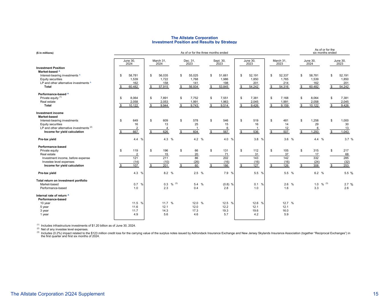 好事达保险公司按策略划分的投资头寸和结果(百万美元)截至或截至截至截至或截至2024年6月30日止六个月的或截至或截至六个月的投资状况和结果(单位:百万美元)2024年3月31日、2024年12月31日、2023年9月30日、2023年6月30日、2023年3月31日、2024年6月30日,2023年度投资头寸以市场为基础^计息投资^ $ 58,781 $ 56,035 $ 55,025 $ 51,661 $ 52,191 $ 52,337 $ 58,781 $ 52,191权益证券1,5391,7221,7681,9861,8501,7651,5391,850有限合伙和其他另类投资^ 162158141198201214162201总计$ 60,482 $ 57,915 $ 56,934 $ 53,845 $ 54,242 $ 54,316 $ 60,482 $ 54,242基于绩效^私募股权(1)$ 8,064 $ 7,891 $ 7,752 $ 7,551 $ 7,381 $ 7,168 $ 8,064 $ 7,381房地产2,0582,0531,9911,9632,0451,9912,0582,045总计$ 10,122 $ 9,944 $ 9,743 $ 9,514 $ 9,426 $ 9,159 $ 10,122 $ 9,426投资收益基于市场的计息投资$ 649 $ 609 $ 578 $ 546 $ 519 $ 481 $ 1 $ 1,证券1613251516142930 LP和其他另类投资(2)2416112613收益计算$ 667 $ 626 $ 604 $ 567 $ 536 $ 507 $ 1,293 $ 1,043税前收益率4.4% 4.3% 4.2% 4.0% 3.8% 3.6% 4.4% 3.7%基于绩效的私募股权$ 119 $ 196 $ 66 $ 131 $ 112 $ 105 $ 315 $ 217房地产215207131371768投资收益,费用前12121186202143142332285被投资方层面费用(14)(10)(26)(16)(16)(16)(24)(32)收入收益率计算107美元201美元60美元186美元127美元126美元308美元253美元税前收益率4.3% 8.2% 2.5% 7.9% 5.5% 5.5% 6.2% 5.5%投资组合总回报率基于市场的0.7% 0.3%(3)5.4%(0.8)% 0.1% 2.6% 1.0%(3)2.7%基于绩效的1.0 2.3 0.4 2.8 1.0 1.6 3.3 2.6内部收益率^基于绩效的10年期11.5% 11.7% 12.0% 12.5% 12.6% 12.7% 5年期11.61 2.11 2.01 2.21 2.11 2.13年期11.71 4.317.3 19.3 19.6 16.01年4.95.6 4.65.7 4.25.9(1)包括截至2024年6月30日的基础设施投资12.0亿美元。(2)扣除任何被投资方层面的费用。(3)包括(0.2%)与Adirondack Insurance Exchange和New Jersey Skylands Insurance Association(统称“互惠交易所”)在2024年第一季度和前六个月发行的盈余票据账面价值的1.23亿美元信用损失相关的影响。好事达保险公司 2Q24补充资料15