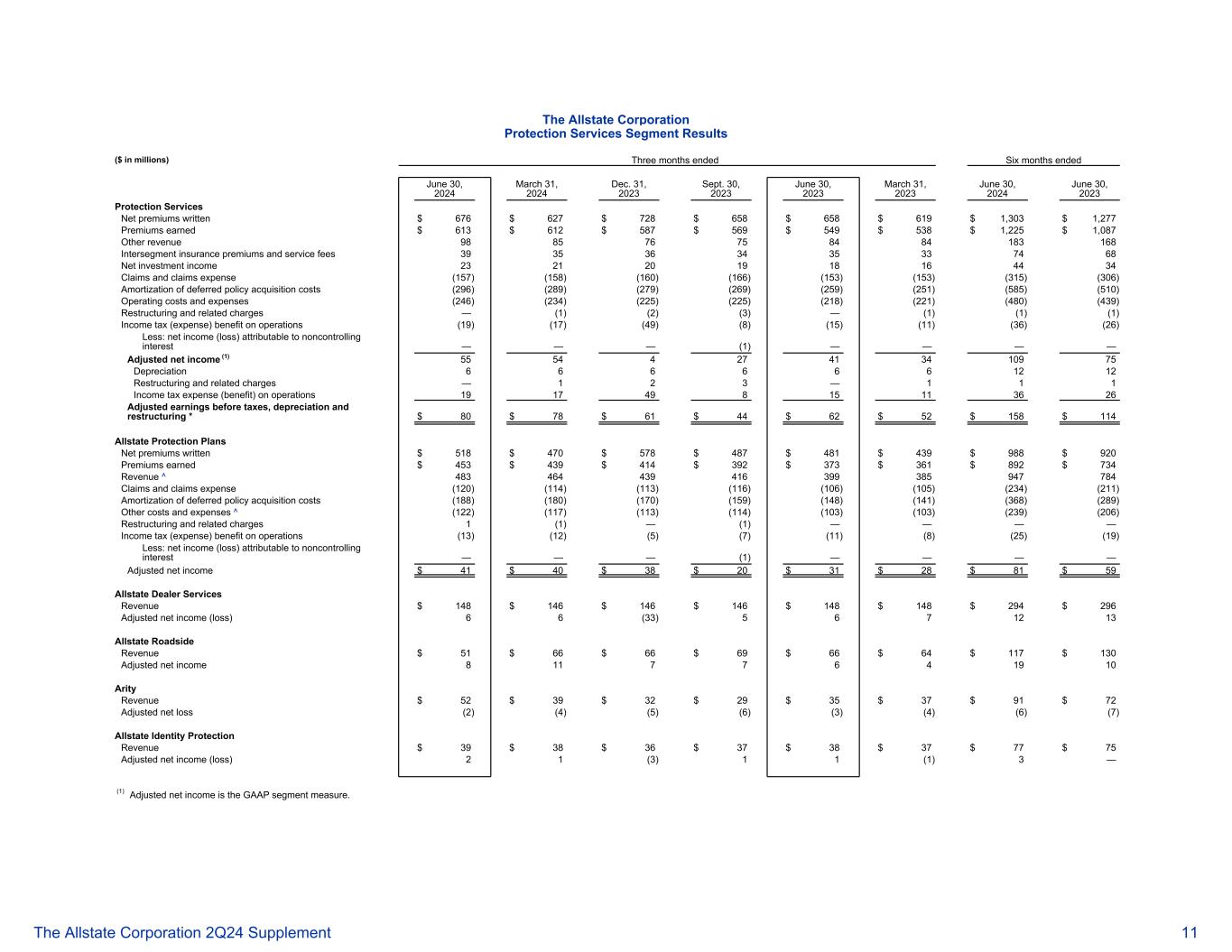 好事达保险公司防护服务部门业绩(百万美元)截至2024年6月30日止三个月2024年3月31日2023年12月31日2023年9月30日2023年6月30日2023年3月31日2024年6月30日,2023 Protection Services Net premiums written $ 676 $ 627 $ 728 $ 658 $ 658 $ 619 $ 1,303 $ 1,277 Premiums earned $ 613 $ 612 $ 587 $ 569 $ 549 $ 538 $ 1,225 $ 1,087 Other revenue 988576758484183168 intersegment intersegment insurance premiums and service fees 3935363435337468 Net investment income 2321201918164434 claims和索赔费用(157)(158)(160)(166)(153)(153)(315)(306)递延保单购置费用摊销(296)(289)(279)(269)(259)(251)(585)(510)营业成本和费用(246)(234)(225)(225)(218)(221)(480)(439)重组及相关费用—(1)(2)(3)—(1)(1)(1)(1)运营所得税(费用)收益(19)(17)(49)(8)(15)(11)(36)(26)减:归属于非控股权益的净收入(亏损)————调整后净收入(1)5554427413410975折旧666661212重组及相关费用— 123 — 111运营所得税费用(收益)191749815113626调整后税前利润,折旧和重组* $ 80 $ 78 $ 61 $ 44 $ 62 $ 52 $ 158 $ 114 好事达保险保护计划净承保保费$ 518 $ 470 $ 578 $ 487 $ 481 $ 439 $ 988 $ 920保费收入$ 453 $ 439 $ 414 $ 392 $ 373 $ 361 $ 892 $ 734收入^ 483464439416399385947784索赔和索赔费用(120)(114)(113)(116)(106)(105)(234)(211)递延保单购置成本摊销(188)(180)(170)(159)(148)(141)(368)(289)其他成本及开支^(122)(117)(113)(114)(103)(103)(239)(206)重组及相关费用1(1)—(1)————运营所得税(费用)福利(13)(12)(5)(7)(11)(8)(25)(19)减:归属于非控股权益的净收入(亏损)————(1)————调整后净收入41美元40美元38美元20美元31美元28美元81美元59美元59美元好事达保险经销商服务收入148美元146美元146美元146美元146美元148美元148美元148美元148美元294美元296美元调整后净收入(亏损)66(33)5671213 好事达保险路边收入51美元66美元66美元69美元66美元64美元117美元130美元调整后净收入81177641910 Arity收入52美元39美元32美元29美元35美元91美元72美元调整后净亏损(2)(4)(5)(6)(3)(4)(6)(7)好事达保险身份保护收入39美元38美元36美元37美元38美元37美元77美元75美元调整后净收入(亏损)21(3)11(1)3 —(1)调整后净收入是GAAP分部衡量标准。好事达保险公司 2Q24补充11