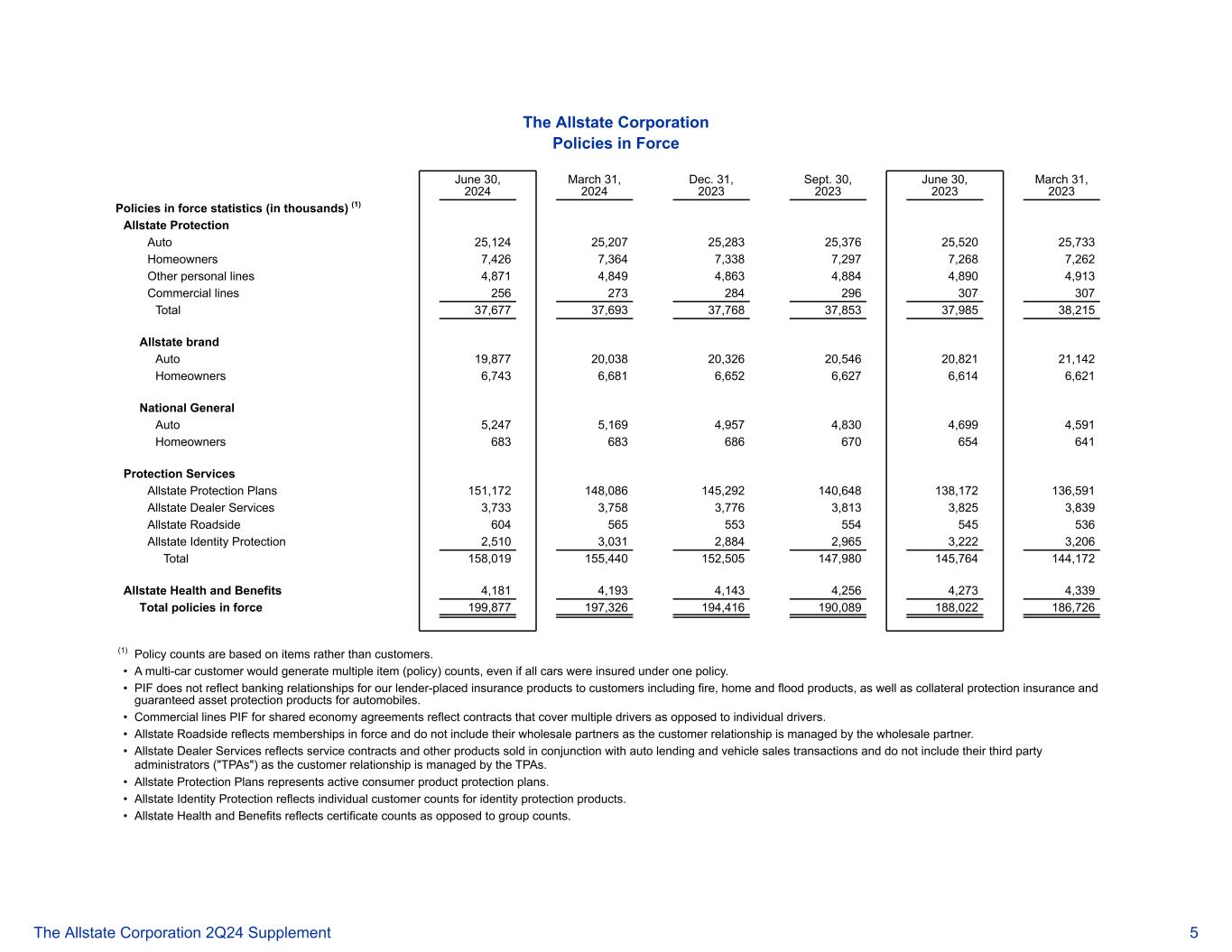 生效的好事达保险公司政策2024年6月30日2024年3月31日2023年12月31日2023年9月30日2023年6月30日2023年3月31日,2023年度有效保单统计(单位:千份)(1)好事达保险 Protection Auto 25,12425,20725,28325,37625,52025,733房主7,4267,3647,3387,2977,2687,262其他个人线路4,8714,8494,8634,8844,8904,913商业线路256273284296307307合计37,67737,69337,76837,85337,98538,215 好事达保险品牌Auto 19,87720,03820,32620,54620,82121,142房主6,7436,6816,6526,6276,6146,621全国通用汽车5,2475,1694,9574,8304,6994,591好事达保险路边604565553554545536 好事达保险身份保护2,5103,0312,8842,9653,2223,206合计158,019155,440152,505147,980145,764144,172 好事达保险 Health and Benefits 4,1814,1934,1434,2564,2734,339有效保单总额199,877197,326194,416190,089188,0 22186,726(1)保单计数基于项目而非客户。•多车客户将生成多个项目(保单)计数,即使所有汽车都在一份保单下投保。• PIF不反映我们的贷款人向客户投放的保险产品的银行关系,包括火灾、家庭和洪水产品,以及抵押品保护保险和汽车的担保资产保护产品。•共享经济协议的商业线PIF反映了涵盖多个司机而非个人司机的合同。• 好事达保险 Roadside反映了有效的会员资格,不包括他们的批发合作伙伴,因为客户关系由批发合作伙伴管理。• 好事达保险经销商服务反映与汽车贷款和车辆销售交易一起销售的服务合同和其他产品,不包括其第三方管理员(“TPA”),因为客户关系由TPA管理。• 好事达保险保护计划代表活跃的消费品保护计划。• 好事达保险身份保护反映身份保护产品的个人客户数量。• 好事达保险健康和福利反映的是证书数量而不是团体数量。好事达保险公司 2Q24补充资料5