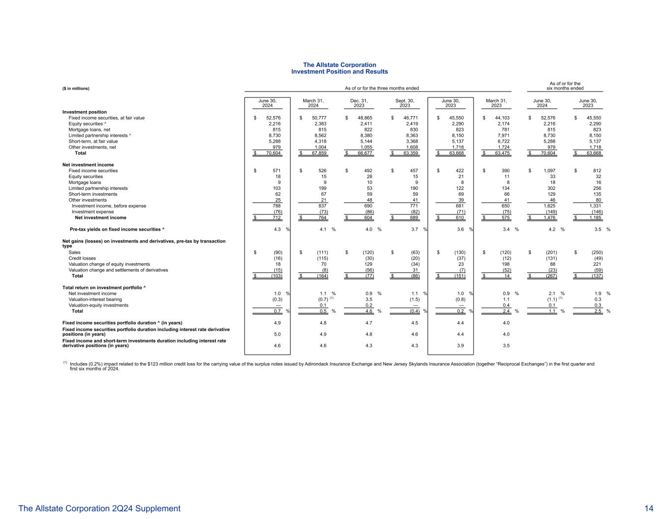 好事达保险公司投资头寸和结果(百万美元)截至或截至截至2024年6月30日止三个月或截至六个月的投资头寸和结果(单位:百万美元)2024年3月31日2023年12月31日2023年9月30日2023年6月30日2023年3月31日2023年6月30日2023年6月30日2023年6月30日投资头寸固定收益证券,公允价值为52,576美元50,777美元48,865美元46,771美元45,550美元44,103美元52,576美元45,550美元权益证券^ 2,2162,3832,4112,4192,2902,1742,2162,290抵押贷款,净额815815822830823781815823有限合伙权益^ 8,7308,5628,3808,3638,1507,9718,7308,150短期,按公允价值5,2884,3185,1443,3685,1376,7225,2885,137其他投资,Net 9791,0041,0551,6081,7181,7249791,718 Total $ 70,604 $ 67,859 $ 66,677 $ 63,359 $ 63,668 $ 63,475 $ 70,604 $ 63,668净投资收益固定收益证券$ 571 $ 526 $ 492 $ 457 $ 422 $ 390 $ 1,097 $ 812权益证券1815281521113332抵押贷款99109881816有限合伙权益103 19953190122134302256短期投资626759596966129135其他投资2521484139414680投资收入,费用前7888376907716816501,6251,331投资费用(76)(73)(86)(82)(71)(75)(149)(146)净投资收益$ 712 $ 764 $ 604 $ 689 $ 610 $ 575 $ 1,476 $ 1,185固定收益证券税前收益率^ 4.3% 4.1% 4.0% 3.7% 3.6% 3.4% 4.2% 3.5%投资及衍生工具净收益(亏损),税前按交易类型销售额$(90)$(111)$(120)$(63)$(130)$(120)$(201)$(250)信用损失(16)(115)(30)(20)(37)(12)(131)(49)股权投资的估值变动1870129(34)2319888221估值变动及衍生工具结算(15)(8)(56)31(7)(52)(23)(59)合计$(103)$(164)$(77)$(86)$(151)$ 14 $(267)$(137)投资组合总回报^投资净收益1.0% 1.1% 0.9% 1.1% 1.0% 0.9% 2.1% 1.9%估值-计息(0.3)(0.7)(1)3.5(1.5)(0.8)1.1(1.1)(1)0.3估值-权益投资— 0.10.2 —— 0.4 0.10.3合计0.7% 0.5% 4.6%(0.4)% 0.2% 2.4% 1.1% 2.5%固定收益证券组合久期^(in年)4.9 4.84.7 4.54.44.0包括利率衍生品头寸在内的固定收益证券组合久期(年)5.0 4.9 4.84.6 4.44.0包括利率衍生品头寸在内的固定收益和短期投资久期(年)4.64.64.64.34.33.9 3.5(1)包括(0.2%)与Adirondack Insurance Exchange和New Jersey Skylands Insurance Association(统称“互惠交易所”)在2024年第一季度和前六个月发行的盈余票据的账面价值1.23亿美元信用损失相关的影响。好事达保险公司 2Q24补充14