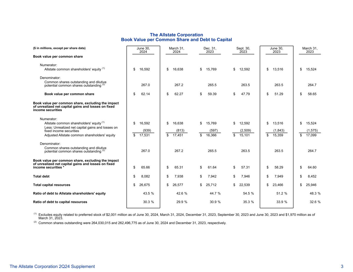 好事达保险公司每股普通股和资本负债的账面价值(百万美元,每股数据除外)2024年6月30日2024年3月31日2023年12月31日2023年9月30日2023年6月30日2023年3月31日每普通股账面价值分子:好事达保险普通股股东权益(1)16,592美元16,638美元15,769美元12,592美元13,516美元15,524分母:已发行普通股和稀释性潜在已发行普通股(2)267.02 67.2265.5 263.5263.5264.7每普通股账面价值62.14美元62.27美元59.39美元47.79美元51.29美元58.65美元每普通股账面价值,不包括固定收益证券未实现净资本损益的影响分子:好事达保险普通股股东权益(1)16,592美元16,638美元15,769美元12,592美元13,516美元15,524美元减:固定收益证券未实现净资本损益(939)(813)(597)(2,509)(1,843)(1,575)调整后的好事达保险普通股股东权益17,531美元17,451美元16,366美元15,101美元15,359美元17,099美元分母:已发行普通股和稀释性潜在已发行普通股(2)267.02 67.2265.5 263.5263.5264.7每普通股账面价值,不包括未实现净资本收益的影响固定收益证券的损失* 65.66美元65.31美元61.64美元57.31美元58.29美元64.60总债务8,082美元7,938美元7,942美元7,946美元7,949美元8,452美元总资本资源26,675美元26,577美元25,712美元22,539美元23,466美元25,946美元债务与好事达保险股东权益的比率43.5% 42.6% 44.7% 54.5% 51.2% 48.3%债务与资本资源的比率30.3% 29.9% 30.9% 35.3% 33.9% 32.6%(1)不包括截至6月30日与优先股相关的股本20.01亿美元,2024年、2024年3月31日、2023年12月31日、2023年9月30日和2023年6月30日,截至2023年3月31日为19.7亿美元。(2)截至2024年6月30日和2023年12月31日,已发行普通股分别为264,030,015股和262,496,775股。好事达保险公司 2Q24补充资料3