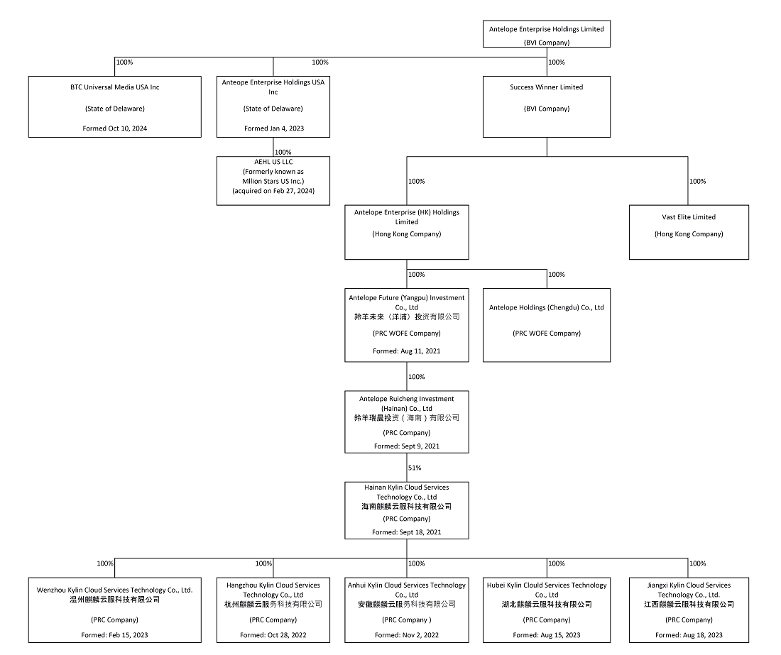 在这份表格20-F的年度报告(“年度报告”)中,除非另有说明,“我们”、“我们”、“我们的”、及“Antelope Enterprises”指英属维尔京群岛公司Antelope Enterprise Holdings Limited(原中国陶瓷有限公司)及其附属公司,包括Antelope Enterprise Holdings USA(“Antelope USA”),该公司为特拉华州注册公司,是Antelope Enterprise的全资附属公司,该公司全资拥有加利福尼亚州有限责任公司AEHL US LLC(“AEHL US”,前称Million Stars US Inc.)、BTC Universal Media USA Inc.(特拉华州注册公司及Antelope Enterprise的全资附属公司)、Success Winner Limited(“Success Winner”),一家英属维尔京群岛公司及Antelope Enterprises的全资附属公司,Vast Elite Limited(“Vast Elite”),Success Winner的香港公司及全资附属公司,以及全资拥有成都Future Talented Management and Consulting Co.,Ltd(“成都Future”)的实体,一家中国运营公司并于2024年11月7日解散,Success Winner的香港公司及全资附属公司,以及全资拥有Antelope Holdings(Chengdu)Co.,Ltd(“Antelope Chengdu”)的实体,一家中国运营公司,以及全资拥有Antelope Future(Yangpu)Investment Co.,Ltd(“Antelope Yangpu”)的实体,一家中国运营公司进而全资拥有羚羊瑞成投资(海南)有限公司(“羚羊瑞成”)进而拥有海南麒麟云服务科技有限公司(“海南麒麟”)51%股权,而全资拥有海南羚羊控股有限公司(“海南羚羊”)的实体,一家中国运营公司(于2024年7月26日解散)进而全资拥有羚羊投资(海南)有限公司(“羚羊投资”)于2024年7月25日解散,海南麒麟拥有杭州麒麟云服务科技有限公司(“杭州麒麟”)100%股权,安徽麒麟云服务科技有限公司(“安徽麒麟”),温州麒麟云服务科技有限公司(“温州麒麟”)、湖北麒麟云服务科技有限公司(“湖北麒麟”)、江西麒麟云服务科技有限公司(“江西麒麟”)。