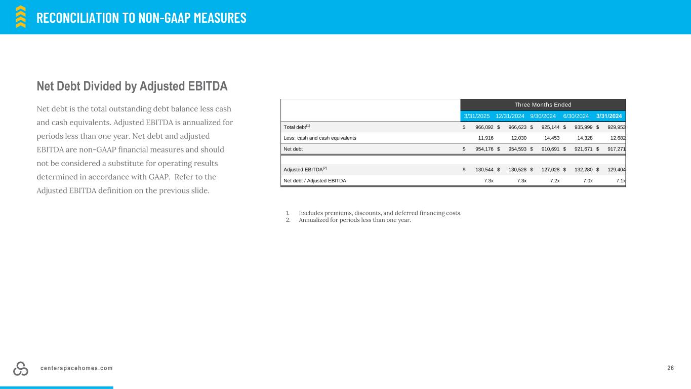 centerspacehomes.com 25普通股股东可获得的净收入(亏损)与调整后EBITDA调整后EBITDA的对账是扣除利息、税项、折旧、摊销、出售房地产和其他投资的损益、房地产投资减值、债务清偿的损益、非自愿转换的损益以及其他非常规项目或不被视为业务运营核心的项目前的收益。该公司认为调整后的EBITDA是一种适当的补充业绩衡量标准,因为它允许投资者查看来自运营的收入,而不会受到折旧、融资成本或非经营性损益的影响。调整后EBITDA是一种非GAAP财务指标,不应被视为替代根据GAAP确定的经营业绩。与非公认会计原则措施的对账与非公认会计原则措施1的对账。包括投资(收益)损失和一次性专业费用。(单位:千)截至3/31/202512/31/20249/30/20246/30/20243/31/2024调整后EBITDA归属于控股权益的净亏损$(3,734)$(5,079)$(1,048)$(1,296)$(3,905)调整:D系列优先单位持有人的股息160160160160160非控制性权益–经营合伙企业和E系列优先单位(643)(900)(1,095)(561)(1,079)非控制性权益前亏损–经营合伙企业和E系列优先单位$(4,217)$(5,819)$(1,983)$(1,697)$(4,824)调整:利息费用9,6229,7828,9329,3189,193与房地产投资相关的摊销27,63227,61626,05925,68926,988非现金伤亡损失(回收)2822,171(632)191702利息收入(616)(662)(558)(462)(280)房地产销售损失----577其他杂项(1)(67)(455)(61)31(5)调整后EBITDA 32,636美元32,633美元31,757美元33,070美元32,351美元