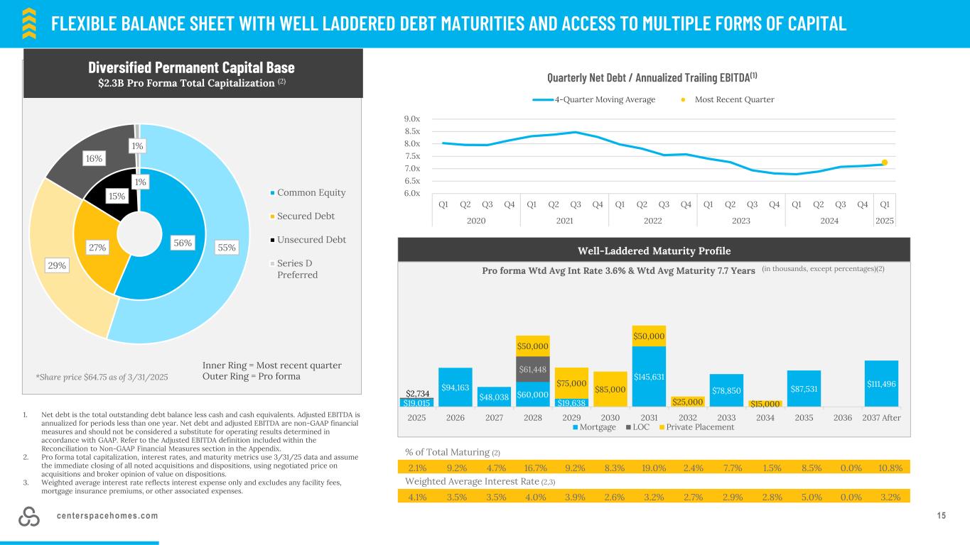 centerspacehomes.com 151。净债务是未偿债务余额总额减去现金和现金等价物。调整后的EBITDA按不到一年的期间进行年化。净债务和调整后EBITDA是非GAAP财务指标,不应被视为替代根据GAAP确定的经营业绩。请参阅附录中与非公认会计原则财务措施的调节部分中包含的调整后EBITDA定义。2.备考总资本、利率和期限指标使用3/31/25数据,并假设所有已注意到的收购和处置立即完成,使用收购的协商价格和处置的价值经纪人意见。3.加权平均利率仅反映利息支出,不包括任何设施费用、抵押贷款保险费或其他相关费用。具有良好负债期限和获得多种形式资本的灵活资产负债表*截至2025年3月31日的股价$ 64.75多元化永久资本基础$ 2.3B备考总资本(2)占到期总资本的百分比(2)2.1% 9.2% 4.7% 16.7% 9.2% 8.3% 19.0% 2.4% 7.7% 1.5% 8.5% 0.0% 10.8%加权平均利率(2,3)4.1% 3.5% 3.5% 4.0% 3.9% 2.6% 3.2% 2.7% 2.9% 2.8% 2.8% 5.0% 0.0% 3.2% Well-Laddered Maturity Profile备考WTD Avg Int Rate 3.6% & WTD Avg Maturity 7.7年(单位:千,百分比除外)(2)6.0x 6.5x 7.0x 7.5x 8.0x 8.5x 9.0x Q1 Q2 Q3 Q4 Q1 Q2 Q3 Q4 Q1 Q2 Q3 Q4 Q1 Q3 Q3 Q4 Q4 Q4 Q4 Q4 Q4 Q4 Q4 Q4 Q4 Q4 Q4 Q4 Q4 Q4 Q4 Q4 Q4 Q4 Q4 Q4 Q4 Q4 Q4 Q4 Q4 Q4 Q4 Q4 Q4 Q4 Q4 Q4 Q4 Q4 Q4 Q4 Q4 Q4 Q4 Q4 Q4 Q4 Q4 Q4 Q4 Q4 Q4 Q4 Q4 Q4 Q4 Q4 Q4 Q4 Q4 Q4 Q4 Q4 Q4 Q4 Q4 Q4 Q4 Q4 Q4 Q4 Q4 Q4 Q4 Q4 Q4 Q4 Q4 Q4 Q4 Q4 Q4 Q4 Q4 Q4 Q4 Q4 Q4 Q4 Q4 Q4 Q4 Q4 Q4 Q4 Q4 Q4 Q4 Q4 Q4 Q4 Q4 Q4 Q4 Q4 Q4 Q4 Q4 Q4 Q4 Q4 Q4 Q4 Q4 Q4 Q3 Q3 Q3 Q3 Q3 Q3 Q3 Q3 Q3 Q3 Q3 Q3 Q3 Q3 Q3 Q3 Q3 Q3 Q3 Q3 Q3 Q3 Q3 Q3 Q3 Q3 Q3 Q3 Q3 Q3 Q3 Q3 Q3 Q3 Q3 Q3 Q3 Q3 Q3 Q3 Q3 Q3 Q3 Q3 Q3 Q3 Q3 Q3 Q3 Q3203220332034203520362037抵押LOC私募后