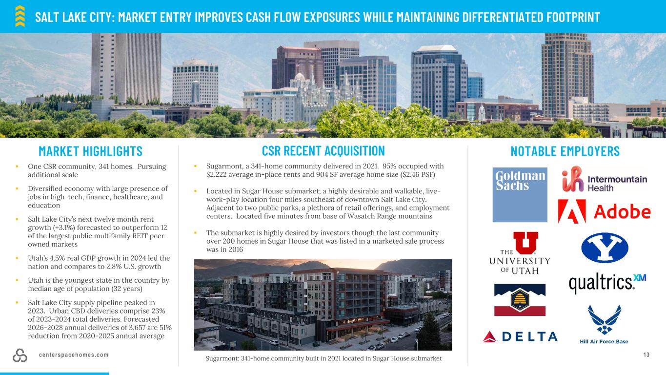 centerspacehomes.com 12Parkhouse Apartment Homes – Thornton,CO地理重点(% of units)资料来源:标普 Capital iQ备注:截至5/21/25。CSR 2025年收购和处置的备考。四舍五入可能导致每一行不会通过改善市场敞口增加100%增强的地理差异公共多家庭REIT市场概览33% 3% 6% 5% 4% 67% 21% 6% 42% 49% 4% 100% 27% 13% 24% 10% 10% 85% 34% 71% 73% 25% 76% 92% 17% 7% 21% 10% 5% 75% 3% 28% 18% 17% 95% Mountain West Midwest West Southeast & Texas Mid-Atlantic Northeast