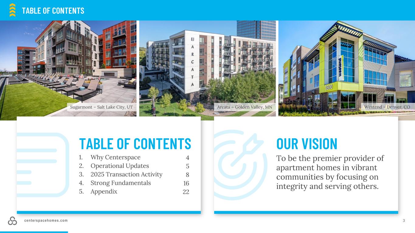 我们的愿景是通过专注于诚信和服务他人,成为充满活力社区中公寓住宅的首要提供者。目录1。为什么是Centerspace 2。运营更新3。2025年交易活动4。基本面强劲5。附录Arcata – Golden Valley,MN目录3centerspacehomes.com Sugarmont – Salt Lake City,UT Westend – Denver,CO 4581622