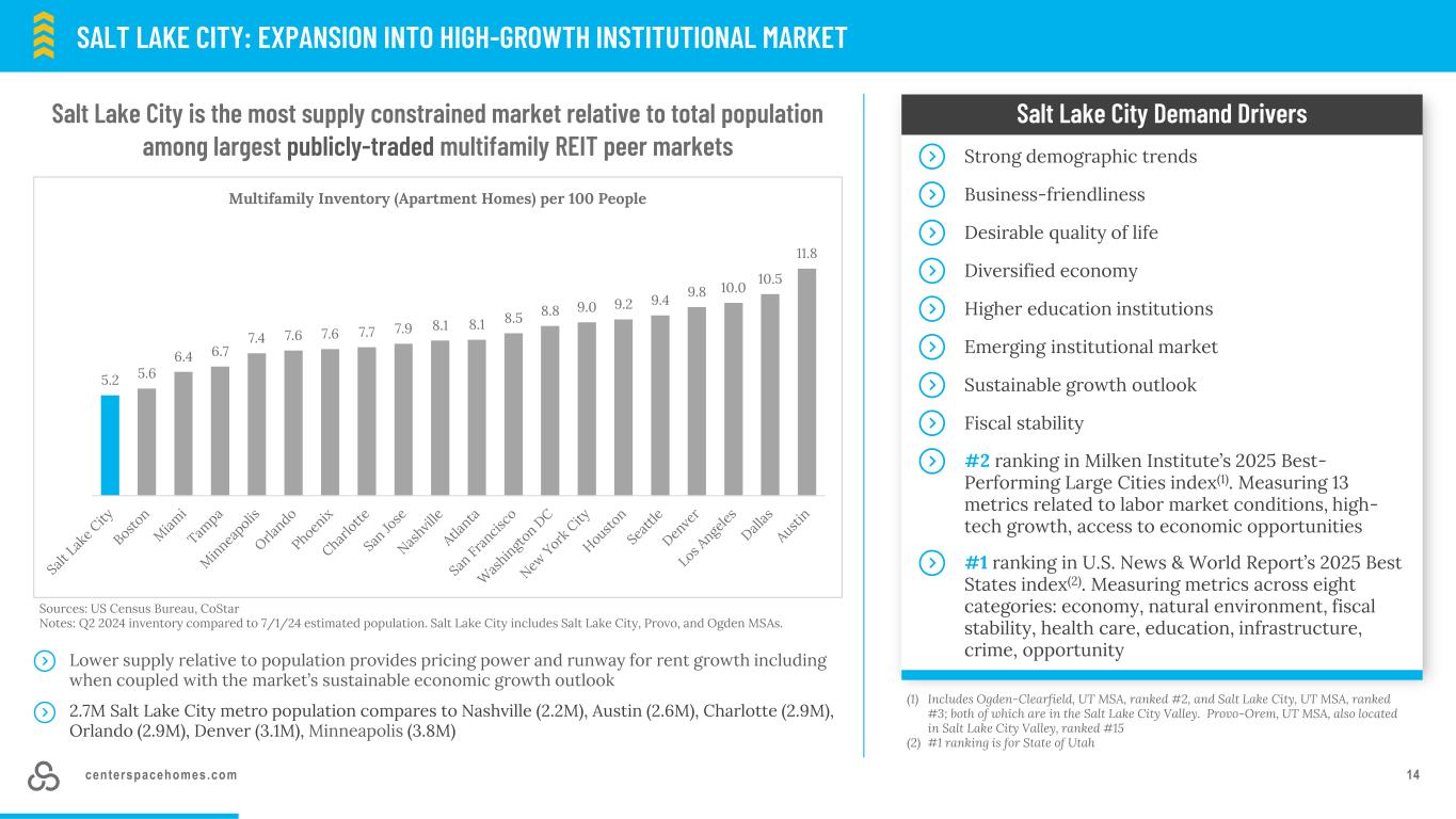 CenterSpacehomes.com 13盐湖城:市场进入改善现金流敞口,同时保持差异化的足迹▪CSR小区1个,341家。追求额外规模▪多元经济,高科技、金融、医疗、教育等岗位大量存在▪盐湖城未来12个月租金增长(+ 3.1%)预测表现优于12个最大的公共多户REIT同业拥有市场▪犹他州2024年实际GDP增长4.5%领跑全国,相比之下美国增长2.8%▪按人口年龄中位数(32岁)计算,犹他州是美国最年轻的州▪盐湖城供应管道在2023年达到峰值。城市CBD交付量占2023-2024年总交付量的23%。预测2026-2028年交付量为3,657辆,较2020-2025年年均减少51%市场亮点显著雇主SCSR最近收购▪Sugarmont,2021年交付的341户社区。95%入住率为2222美元的平均就地租金和904平方英尺的平均房屋面积(2.46美元PSF)▪位于Sugar House子市场;位于盐湖城市中心东南四英里处的一个非常令人向往且适合步行的生活-工作-娱乐地点。毗邻两个公共公园、大量零售产品和就业中心。距离Wasatch Range山脉基地五分钟路程▪尽管Sugar House上一个在市场销售过程中上市的社区超过200套住宅是在2016年Sugarmont:位于Sugar House子市场的2021年建造的341套住宅社区,但投资者非常希望该子市场