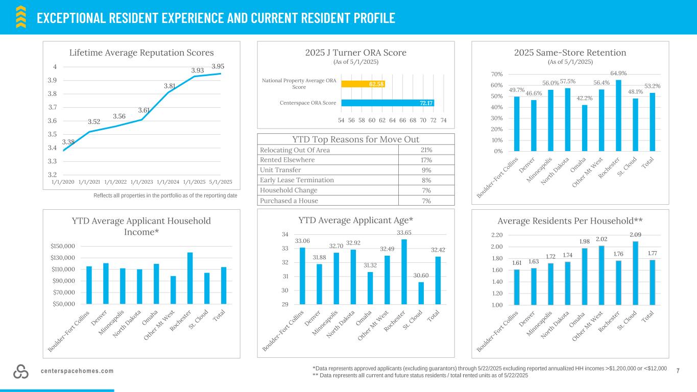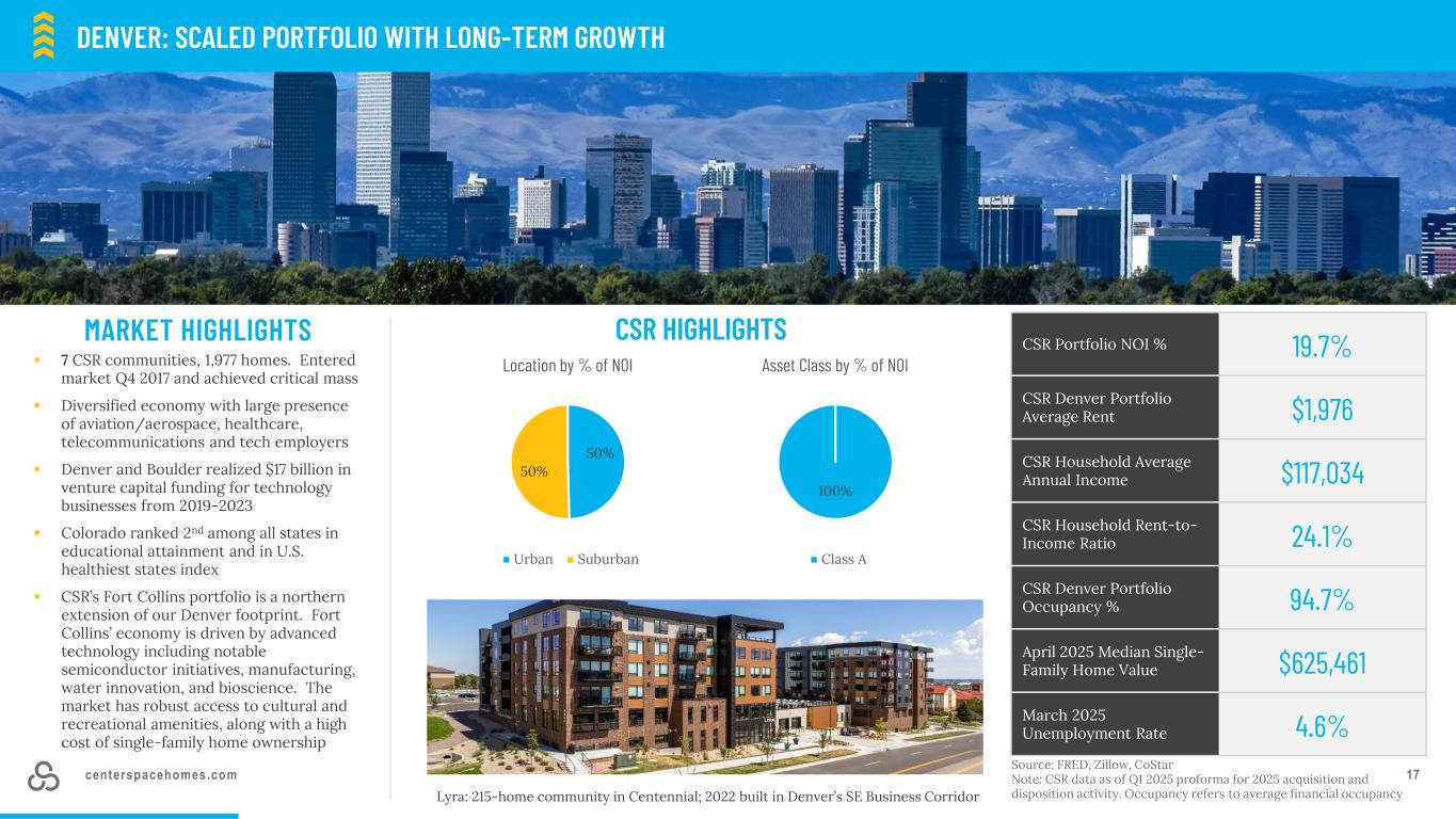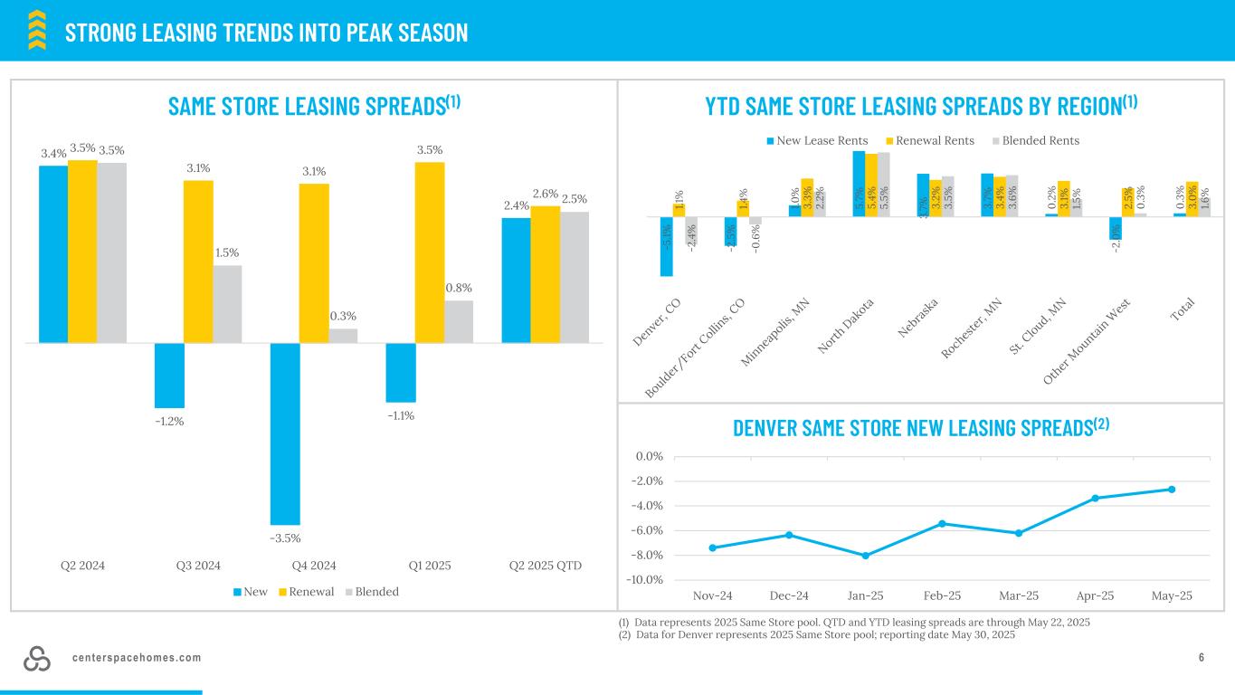 centerspacehomes.com 63.4%-1.2 %-3.5 %-1.1 % 2.4% 3.5% 3.1% 3.1% 3.5% 2.6% 3.5% 1.5% 0.3% 0.8% 2.5% Q2 2024 Q3 2024 Q4 2024 Q1 2025Q2 2025QTD同店租赁价差(1)新更新混合-5. 1%-2. 5% 1.0% 5。7% 3.7% 3.7% 0.2% -2 .0 % 0.3% 1.1 % 1.4 % 3.3% 5.4% 3.2% 3.4% 3.1% 2.5% 3.0% -2 .4 % -0 .6 % 2.2% 5.5% 3.5% 3.6% 1.5 % 0.3% 1.6%年初至今按区域划分的同店租赁利差(1)新租赁租金续租租金混合租金强劲租赁趋势进入旺季(1)数据代表2025年同店池。QTD和YTD租赁价差截至2025年5月22日(2)丹佛的数据代表2025年同店池;报告日期2025年5月30日-10.0 %-8.0 %-6.0 %-4.0 %-2.0 % 0.0% Nov-24 Dec-24 Jan-25 Feb-25 Mar-25 Apr-25 May-25 Denver同店新租赁价差(2)
