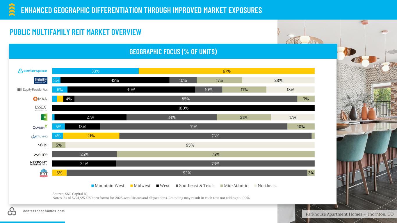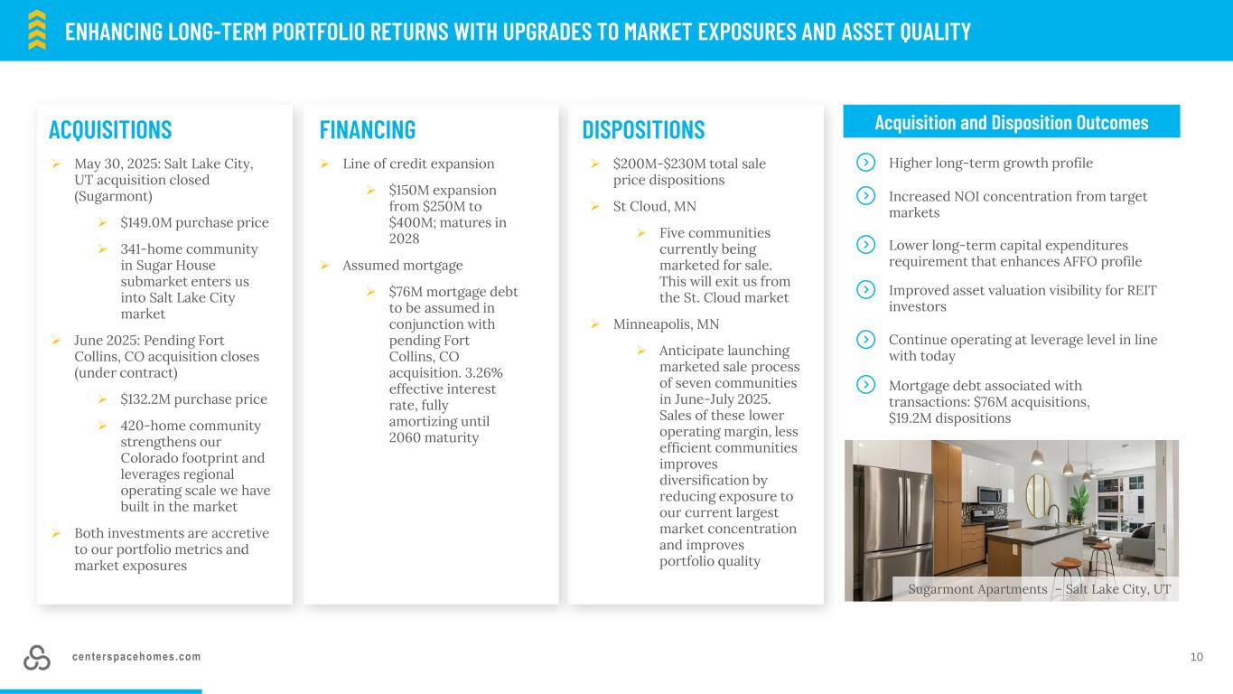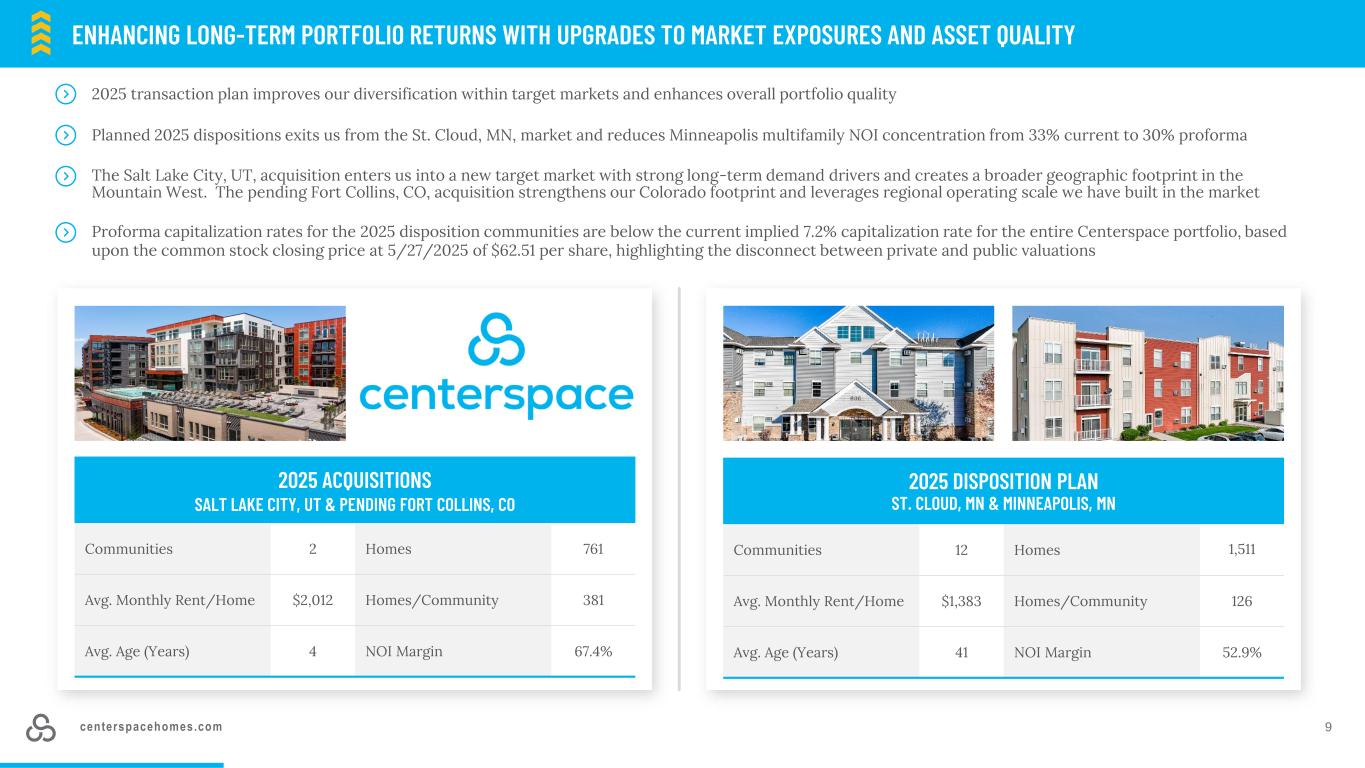 centerspacehomes.com通过上调市场敞口和资产质量来提高长期投资组合回报92025年处置计划ST. cloud,MN & MINNEAPOLIS,MN Communities 12 homes 1,511 avg。月租/房屋$ 1,383房屋/社区126平均年龄(岁)41 NOI利润率52.9% 2025年收购犹他州盐湖城& COLLINS堡,CO社区2个住宅平均761套。月租/房屋$ 2,0 12房屋/社区381平均Age(Years)4 NOI Margin 67.4% The Salt Lake City,UT,acquisition enters us into a new target market with strong long-term demand drivers and create a broader geographical foop in the Mountain West。悬而未决的科罗拉多州科林斯堡收购加强了我们在科罗拉多州的足迹,并利用了我们在市场中建立的区域运营规模。基于2025年5月27日每股62.51美元的普通股收盘价,2025年处置社区的备考资本化率低于整个Centerspace投资组合当前隐含的7.2%的资本化率,这凸显了私人和公共估值之间的脱节,计划中的2025年处置使我们从明尼苏达州的圣克劳德退出,市场并将明尼阿波利斯多户家庭NOI集中度从目前的33%降低到30%的2025年交易计划改善了我们在目标市场内的多元化并提高了整体投资组合质量
