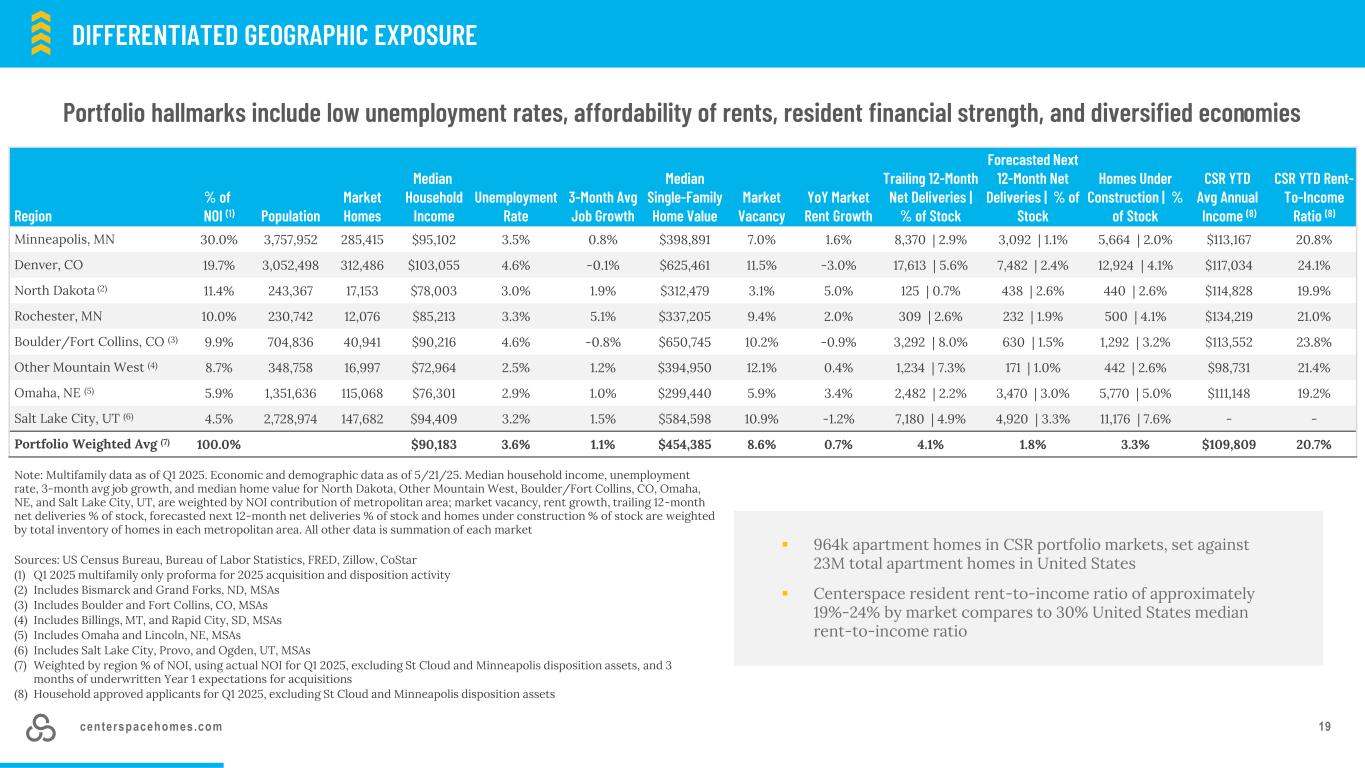centerspacehomes.com 18▪备考20 CSR社区,4032家。机会焦点市场▪多元经济,医疗、医疗科技、金融、食品生产和零售雇主▪相对于17个沿海和阳光地带市场,明尼阿波利斯(+ 4.3%)预测未来12个月的租金增长最为强劲,公共多户REIT同行拥有的约80%的公寓住宅位于这些市场▪在大型都市圈中失业率最低的2024年排名并列第1▪每100万人排名世界500强总部第2位;17家世界500强▪明尼阿波利斯和圣保罗排名第5在美国大型地铁可负担性指数中排名第6▪在拥有至少7.5万套住房的52个市场中,以库存百分比排名全国吸纳量前10名市场亮点Noko:2021年建造的130户社区,毗邻Nokomis湖的24k SF杂货店CSR Portfolio NOI % 30.0% CSR Minneapolis Portfolio平均租金$ 1,579 CSR家庭平均年收入$ 113,167 CSR家庭租金收入比20.8% CSR Minneapolis Portfolio Occupancy % 95.5% April 2025 Median Single-family home value $ 398,891 March 2025 Unemployment rate 3.5% Minneapolis:competitive advantage CSR HIGHLIGHTS来源:FRED,Zillow,COStar,明尼苏达州就业和经济发展部注:截至2025年第一季度的CSR数据2025年收购和处置活动的形式。入住率指平均财务入住率8% 28% 64%位置按% NOI城市核心内环外环41% 59%资产类别按% NOI A类B类