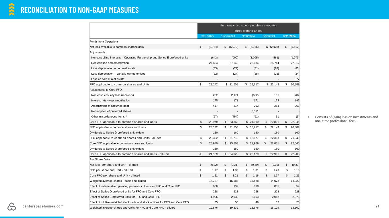 centerspacehomes.com 24与非公认会计原则措施的对账更新了与非公认会计原则措施的对账与非公认会计原则措施1的对账。包括投资(收益)损失和一次性专业费用。(以千为单位,每股金额除外)截至2025年3月31日止三个月12/31/20249/30/20246/30/20243/31/2024来自运营的资金普通股股东可获得的净亏损$(3,734)$(5,079)$(6,166)$(2,903)$(5,512)调整:非控制性权益–经营合伙和E系列优先单位(643)(900)(1,095)(561)(1,079)折旧和摊销27,65427,64026,08425,71427,012减折旧–非房地产(83)(79)(81)(82)(85)减折旧–部分拥有的实体(22)(24)(25)(24)出售房地产的损失---577适用于普通股的FFO和单位23,172美元21,558美元18,717美元22,143美元20,889核心FFO调整:非现金伤亡损失(追回)2822,171(632)191702利率掉期摊销1751711713197承担债务摊销4174173263263赎回优先股--3,511--其他杂项(1)(67)(454)(61)31(5)适用于普通股和单位的核心FFO 23,979美元23,863美元21,969美元22,801美元22,046美元适用于普通股的FFO和单位23,172美元21,558美元18,717美元22,143美元20,889美元适用于普通股和单位的D系列优先单位持有人的股息160160160160160160 FFO-稀释后23,332美元21,718美元18,877美元22,303美元21,049美元适用于普通股和单位的核心FFO 23,979美元23,863美元21,969美元22,801美元22,046美元适用于普通股和单位的D系列优先单位持有人的股息160160160160160160核心FFO-稀释后24,139美元24,023美元22,129美元22,961美元22,206美元每股数据净亏损单位-稀释后每股FFO $(0.22)$(0.31)$(0.40)$(0.19)$(0.37)单位-稀释后每股FFO $ 1.17 $ 1.09 $ 1.01 $ 1.23 $ 1.16核心FFO和单位-稀释后每股FFO $ 1.21 $ 1.21 $ 1.18 $ 1.27 $ 1.23加权平均股-基本和稀释后16,72716,58315,52814,97214,922可赎回经营合伙单位对FFO和核心FFO的影响980939818835854 D系列优先单位对FFO的影响和核心FFO 228228228228对FFO和核心FFO的E系列优先单位的影响1,9062,0332,0532,0622,078对FFO和核心FFO的稀释性限制性股票单位和股票期权的影响3556493220对FFO和核心FFO的加权平均股份和单位-稀释19,87619,83918,67618,12918,102