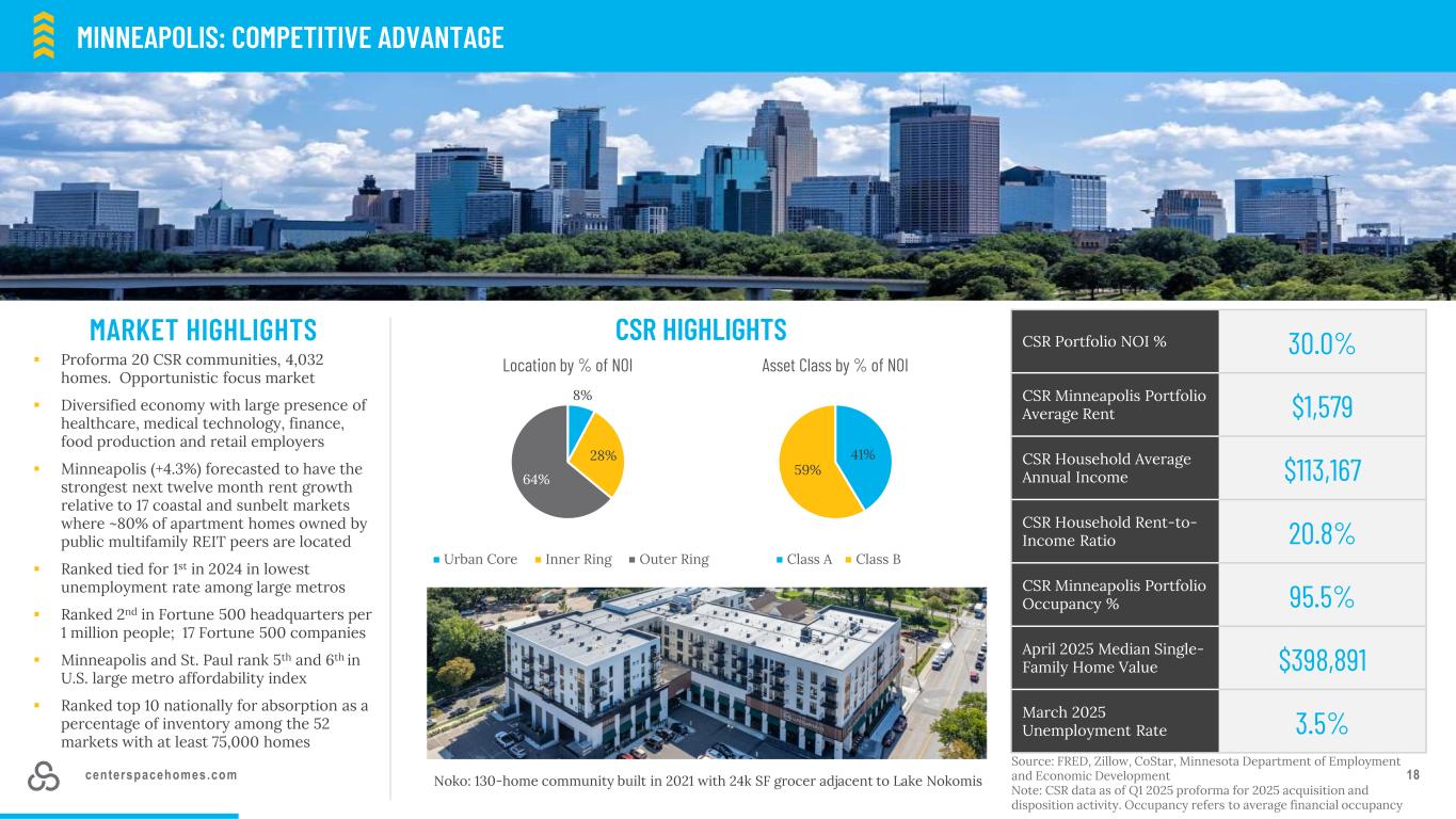 centerspacehomes.com 17▪7个CSR社区,1977家。2017年Q4进入市场,实现临界质量▪多元化经济,航空/航天、医疗保健、电信和科技雇主大量存在▪丹佛和博尔德在2019-2023年为科技企业实现了170亿美元的风险投资资金▪科罗拉多州在所有州的教育程度和美国最健康州指数中排名第2▪CSR的Fort Collins投资组合是我们丹佛足迹的北部延伸。柯林斯堡的经济受到先进技术的推动,包括显着的半导体举措、制造业、水创新和生物科学。市场对文化和娱乐设施的准入强劲,伴随着单户家庭拥有住房的高成本市场亮点Lyra:建于百年的215户社区;2022年建于丹佛SE商业走廊CSR Portfolio NOI % 19.7% CSR Denver Portfolio平均租金$ 1,976 CSR家庭平均年收入$ 117,034 CSR家庭租金收入比24.1% CSR Denver Portfolio Occupancy % 94.7% April 2025 Median single-family home value $ 625,461 March 2025 Unemployment rate 4.6% Denver:Scaled portfolio with long-term growth CSR highlights 100% asset class by % of NOI Class A 50% 50% location by % of NOI Urban Suburban Source:FRED,Zillow,CoStar注:截至2025年第一季度的CSR数据2025年收购和处置活动的形式。入住率指平均财务占用