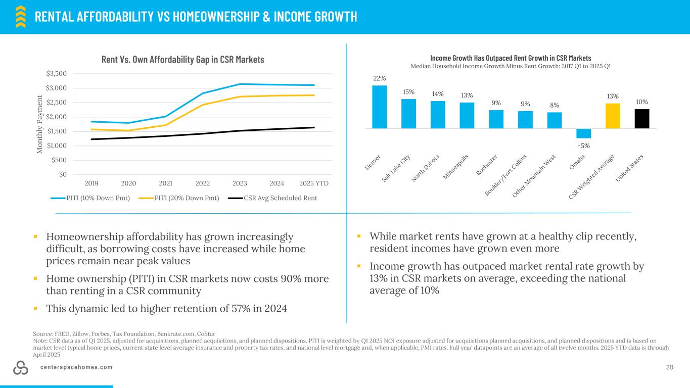 centerspacehomes.com 19 region % of NOI(1)人口市场住房中位数家庭收入失业率3个月平均就业增长中位数单户住房价值市场空置率同比市场租金增长落后12个月净交付|预测未来12个月净交付的股票百分比|在建存量住房百分比|股票CSR年初至今平均年收入百分比(8)CSR年初至今租金收入比(8)明尼苏达州明尼阿波利斯市30.0% 3,757,952285,415美元95,1023.5% 0.8% 398,8917.0% 1.6% 8,370 | 2.9% 3,092 | 1.1% 5,664 | 2.0% 113,16720.8%丹佛,CO 19.7% 3,052,498312,486 $ 103,0554.6%-0.1 % $ 625,4611.5%-3.0 % 17,613 | 5.6% 7,482 | 2.4% 12,924 | 4.1% $ 117,03424.1%北达科他州(2)11.4% 243,36717,153 $ 78,0033.0% 1.9% $ 312,4793.1% 5.0% 125 | 0.7% 438 | 2.6% 440 | 2.6% $ 114,82819.9%罗切斯特,明尼苏达州10.0% 230,74212,076 $ 85,2133.3% 5.1% $ 337,2059.4% 2.0% 309 | 2.6% 232 | 1.9% 500 | 4.1% $ 134,21921.0%博尔德/柯林斯堡,CO(3)9.9% 704,83640,941 $ 90,2164.6%-0.8 % $ 650,74510.2%-0.9 % 3,292 | 8.0% 630 | 1.5% 1,292 | 3.2% $ 113,55223.8% Other Mountain West(4)8.7% 348,75816,997 $ 72,9642.5% 1.2% $ 394,95012.1% 0.4% 1,234 | 7.3% 171 | 1.0% 442 | 2.6% $ 98,73121.4% Omaha,NE(5)5.9% 1,351,636115,068 $ 76,3012.9% 1.0% $ 299,4405.9% 3.4% 2,482 | 2.2% 3,470 | 3.0% 5,770 | 5.0% $ 111,14819.2%盐湖城,UT(6)4.5% 2,728,974147,682 $ 94,4093.2% 1.5% $ 584,598 10.9%-1.2 % 7,180 | 4.9% 4,920 | 3.3% 11,176 | 7.6%--投资组合加权平均(7)100.0% $ 90,1833.6% 1.1% $ 454,3858.6% 0.7% 4.1% 1.8% 3.3% $ 109,80920.7%注:截至2025年第一季度的多户数据。截至5/21/25的经济和人口数据。北达科他州、其他西部山区、科罗拉多州博尔德/柯林斯堡、东北部奥马哈和犹他州盐湖城的家庭收入中位数、失业率、3个月平均就业增长和房屋价值中位数,由大都市区NOI贡献加权;市场空置率、租金增长、过去12个月净交付量占存量百分比、预测未来12个月净交付量占存量百分比和在建房屋占存量百分比由每个大都市区的房屋总库存加权。所有其他数据均为各市场来源的总和:美国人口普查局、劳工统计局、FRED、Zillow、COStar(1)2025年第一季度仅多户家庭2025年收购和处置活动的形式(2)包括Bismarck和Grand Forks、ND、MSAs(3)包括Boulder和Fort Collins、CO、MSAs(4)包括Billings、MT,Rapid City、SD、MSAs(5)包括Omaha和Lincoln、NE、MSAs(6)包括盐湖城、普罗沃和犹他州奥格登,MSAs(7)按地区加权NOI的百分比,使用2025年第一季度的实际NOI,不包括ST Cloud和明尼阿波利斯处置资产,和3个月承销的第1年收购预期(8)2025年第一季度家庭批准的申请人,不包括ST Cloud和明尼阿波利斯处置资产创新–提供不同的风险敞口▪CSR投资组合市场96.4万套公寓住宅,对比美国2300万套公寓住宅总量▪按市场划分,Centerspace的居民租金收入比约为19%-24 %,而美国的租金收入比中位数为30%。美国不同地域风险投资组合的特征包括低失业率、租金的可负担性、居民的财务实力以及多元化的经济