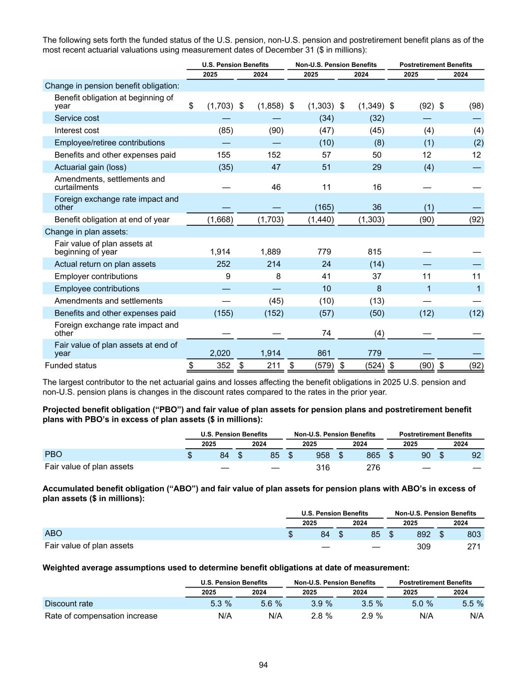 下文阐述了美国养老金的资金状况,非美国养老金和退休后福利计划截至最近一次使用12月31日计量日期的精算估值(百万美元):美国养老金福利非美国养老金福利退休后福利202520242025202420252024养老金福利义务变化:年初福利义务$(1,703)$(1,858)$(1,303)$(1,349)$(92)$(98)服务成本——(34)(32)——利息成本(85)(90)(47)(45)(4)(4)雇员/退休人员缴款——(10)(8)(1)(2)福利及支付的其他费用15515257501212精算利(损)(35)475129(4)—修正,结算和限电— 461116 ——汇率影响及其他——(165)36(1)——年末福利义务(1,668)(1,703)(1,440)(1,303)(90)(92)计划资产变动:年初计划资产公允价值1,9141,889779815 ——计划资产实际收益率25221424(14)——雇主缴款9841371111雇员缴款—— 10811修正和结算——(45)(10)(13)——福利支付的其他费用(155)(152)(57)(50)(12)(12)汇率影响及其他—— 74(4)——年末计划资产的公允价值2,0 201,914861779 ——资金状况$ 352 $ 211 $(579)$(524)$(90)$(92)2025年美国养老金和非美国养老金计划中影响福利义务的净精算损益的最大贡献者是贴现率与上一年的费率相比的变化。PBO超过计划资产的养老金计划和退休后福利计划的预计福利义务(“PBO”)和计划资产的公允价值(百万美元):美国养老金福利非美国养老金福利退休后福利202520242025202420252024 PBO 84美元85美元958美元865美元90美元92美元计划资产的公允价值—— 316276 ——累计福利义务(“ABO”)及计划资产的公允价值对于ABO超过计划资产的养老金计划(百万美元):美国养老金福利非美国养老金福利2025202420252024 ABO 84美元85美元892美元803美元计划资产的公允价值—— 309271用于确定计量日福利义务的加权平均假设:美国养老金福利非美国养老金福利退休后福利20252024202420252024贴现率5.3% 5.6% 3.9% 3.5% 5.0% 5.5%报酬增加率不适用不适用不适用2.8% 2.9%不适用不适用94