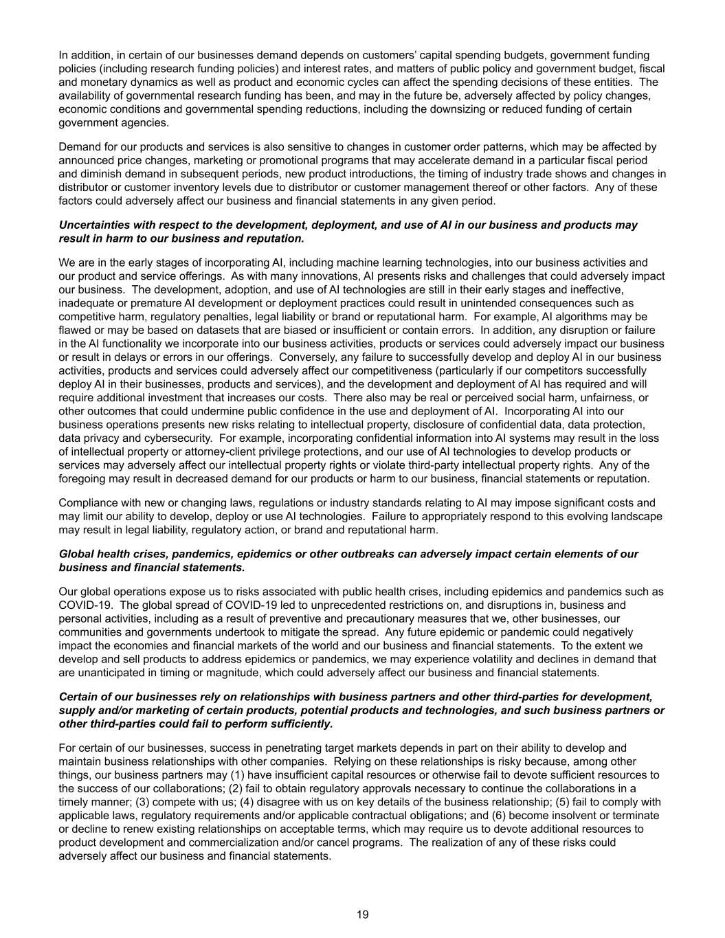 此外,在我们的某些业务中,需求取决于客户的资本支出预算、政府资助政策(包括研究资助政策)和利率,而公共政策和政府预算、财政和货币动态以及产品和经济周期等事项可能会影响这些实体的支出决策。政府研究经费的可获得性一直受到、而且将来可能受到政策变化、经济状况和政府开支削减的不利影响,包括某些政府机构的缩编或经费减少。对我们产品和服务的需求也对客户订单模式的变化很敏感,这可能会受到已宣布的价格变化、营销或促销计划的影响,这些变化可能会加速特定财政期间的需求并减少后续期间的需求、新产品的推出、行业贸易展览的时间安排以及由于分销商或其客户管理或其他因素导致的分销商或客户库存水平的变化。这些因素中的任何一个都可能对我们在任何特定时期的业务和财务报表产生不利影响。在我们的业务和产品中开发、部署和使用人工智能方面的不确定性可能会对我们的业务和声誉造成损害。我们正处于将人工智能(包括机器学习技术)纳入我们的业务活动以及我们的产品和服务产品的早期阶段。与许多创新一样,人工智能带来了可能对我们的业务产生不利影响的风险和挑战。人工智能技术的开发、采用和使用仍处于早期阶段,无效、不充分或过早的人工智能开发或部署实践可能会导致意想不到的后果,例如竞争损害、监管处罚、法律责任或品牌或声誉损害。例如,人工智能算法可能存在缺陷,或者可能基于有偏见或不充分或包含错误的数据集。此外,我们纳入业务活动、产品或服务的AI功能的任何中断或故障都可能对我们的业务产生不利影响,或导致我们的产品出现延迟或错误。相反,任何未能在我们的业务活动、产品和服务中成功开发和部署人工智能都可能对我们的竞争力产生不利影响(特别是如果我们的竞争对手成功地在他们的业务、产品和服务中部署人工智能),而人工智能的开发和部署已经需要并且将需要额外的投资,从而增加我们的成本。还可能存在真实的或感知到的社会伤害、不公平或其他结果,这些结果可能会削弱公众对使用和部署人工智能的信心。将人工智能纳入我们的业务运营会带来与知识产权、机密数据披露、数据保护、数据隐私和网络安全相关的新风险。例如,将机密信息纳入AI系统可能会导致知识产权或律师-委托人特权保护的丧失,我们使用AI技术开发产品或服务可能会对我们的知识产权产生不利影响或侵犯第三方知识产权。上述任何情况都可能导致对我们产品的需求减少或损害我们的业务、财务报表或声誉。遵守与人工智能相关的新的或不断变化的法律、法规或行业标准可能会带来巨大的成本,并可能限制我们开发、部署或使用人工智能技术的能力。未能对这一不断变化的环境做出适当回应可能会导致法律责任、监管行动或品牌和声誉损害。全球健康危机、流行病、流行病或其他爆发可能对我们业务和财务报表的某些要素产生不利影响。我们的全球业务使我们面临与公共卫生危机相关的风险,包括流行病和流行病,如新冠肺炎。新冠疫情的全球传播导致商业和个人活动受到前所未有的限制和中断,包括由于我们、其他企业、我们的社区和政府为缓解传播而采取的预防和预防措施。任何未来的流行病或大流行病都可能对世界经济和金融市场以及我们的业务和财务报表产生负面影响。如果我们开发和销售应对流行病或流行病的产品,我们可能会遇到时间或规模上无法预料的波动和需求下降,这可能会对我们的业务和财务报表产生不利影响。我们的某些业务依赖与业务合作伙伴和其他第三方的关系来开发、供应和/或营销某些产品、潜在产品和技术,而这些业务合作伙伴或其他第三方可能无法充分履行职责。对于我们的某些业务, 能否成功打入目标市场,部分取决于它们与其他公司发展和维持业务关系的能力。依赖这些关系是有风险的,因为,除其他外,我们的业务合作伙伴可能(1)没有足够的资本资源或未能以其他方式为我们的合作成功投入足够的资源;(2)未能及时获得继续合作所需的监管批准;(3)与我们竞争;(4)在业务关系的关键细节上与我们意见相左;(5)未能遵守适用的法律、监管要求和/或适用的合同义务;(6)破产或终止或拒绝以可接受的条款续签现有关系,这可能需要我们为产品开发和商业化投入额外资源和/或取消计划。任何这些风险的实现都可能对我们的业务和财务报表产生不利影响。19