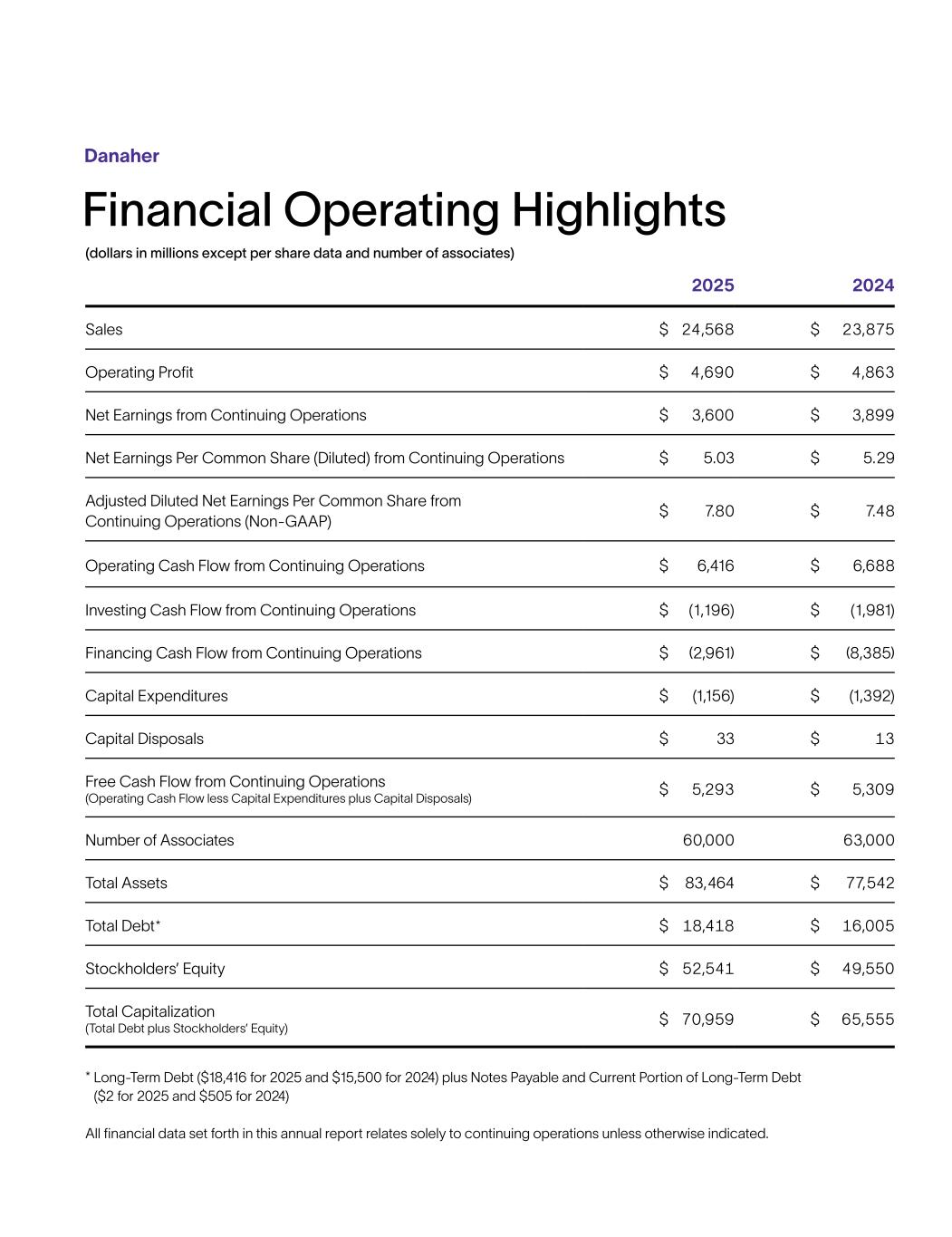 财务经营亮点丹纳赫(百万美元,每股数据除外和联营公司数量)20252024年销售额24,568美元23,875美元营业利润4,690美元4,863美元持续经营业务净收益3,600美元3,899美元持续经营业务每股普通股净收益(稀释后)5.03美元5.29美元调整后持续经营业务每股普通股摊薄净收益(非公认会计准则)7.80美元7.48美元持续经营业务经营现金流6,416美元6,688美元持续经营业务投资现金流$(1,196)$(1,981)持续经营业务筹资现金流$(2,961)$(8,385)资本支出$(1,156)$(1,392)资本处置$ 33 $ 13自由现金流自持续经营(经营现金流减资本支出加资本处置)$ 5,293 $ 5,309联营公司数量60,00063,000总资产$ 83,464 $ 77,542总债务*18,418美元16,005美元股东权益52,541美元49,550美元总资本(总债务加上股东权益)70,959美元65,555美元*长期债务(2025年为18416美元,2024年为15500美元)加上应付票据和长期债务的流动部分(2025年为2美元,2024年为505美元)本年度报告中列出的所有财务数据仅与持续经营有关,除非另有说明。
