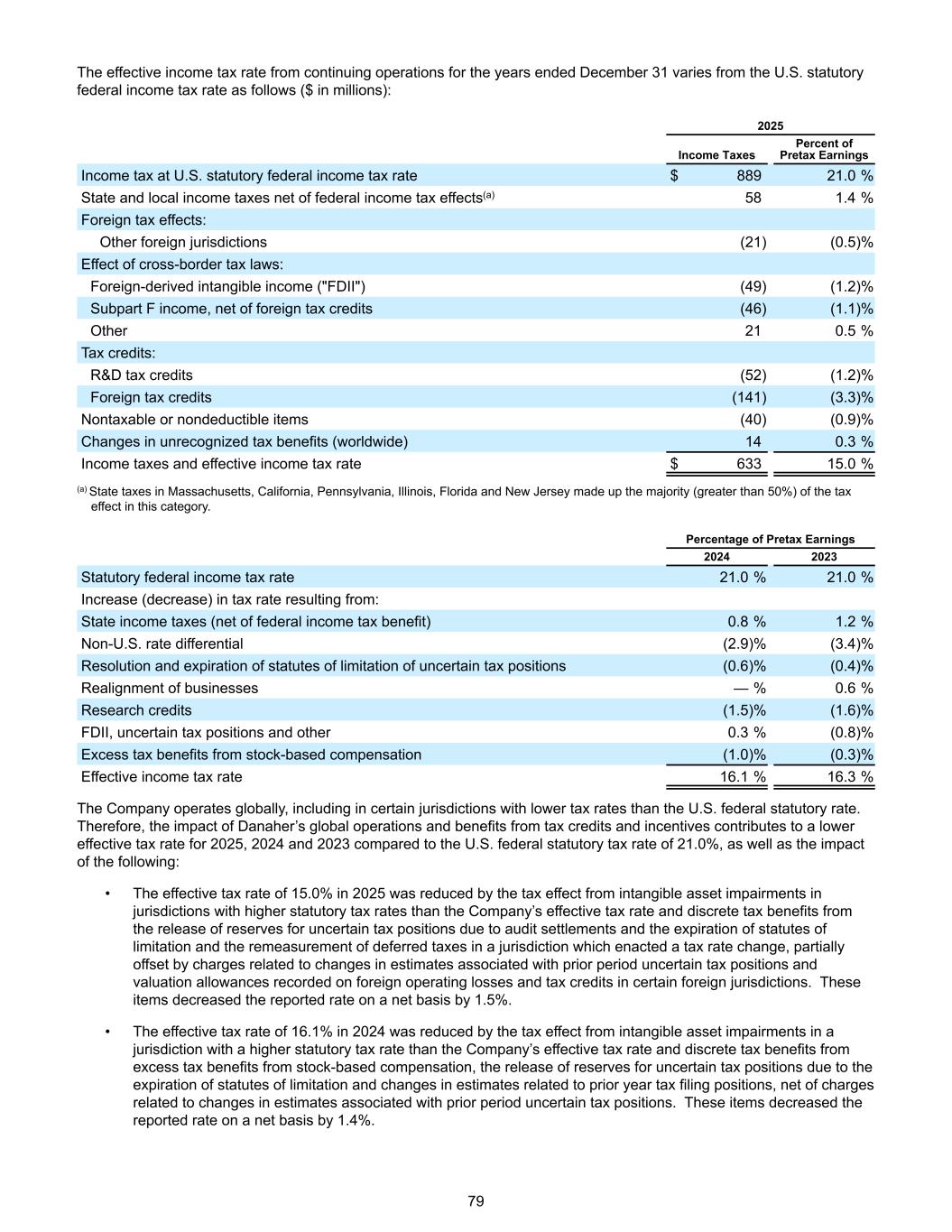截至12月31日止年度持续经营业务的有效所得税率与美国法定联邦所得税率的差异如下(百万美元):2025年所得税按美国法定联邦所得税率计算的税前收益所得税百分比889美元21.0%扣除联邦所得税影响的州和地方所得税(a)581.4%外国税收影响:其他外国司法管辖区(21)(0.5)%跨境税法的影响:外国衍生的无形收入(“FDII”)(49)(1.2)% F子项收入,扣除外国税收抵免(46)(1.1)%其他210.5%税收抵免:研发税收抵免(52)(1.2)%外国税收抵免(141)(3.3)%不可课税或不可扣除项目(40)(0.9)%未确认的税收优惠变化(全球范围)140.3%所得税和有效所得税率$ 63315.0%(a)马萨诸塞州、加利福尼亚州、宾夕法尼亚州、伊利诺伊州、佛罗里达州和新泽西州的州税占这一类别税收影响的大部分(大于50%)。税前利润百分比20242023法定联邦所得税率21.0% 21.0%税率增加(减少)源于:州所得税(扣除联邦所得税优惠)0.8% 1.2%非美国税率差异(2.9)%(3.4)%解决和不确定税收状况的时效到期(0.6)%(0.4)%业务调整——% 0.6%研究信贷(1.5)%(1.6)% FDII,不确定的税务状况和其他0.3%(0.8)%股票薪酬带来的超额税收优惠(1.0)%(0.3)%有效所得税率16.1% 16.3%公司在全球范围内运营,包括在某些税率低于美国联邦法定税率的司法管辖区。因此,受丹纳赫全球业务的影响以及税收抵免和激励措施带来的好处,导致2025、2024和2023年的有效税率低于美国联邦法定税率21.0%,以及以下因素的影响:• 2025年15.0%的实际税率因法定税率高于公司实际税率的司法管辖区的无形资产减值产生的税收影响而降低,以及因审计结算和时效到期以及颁布税率变化的司法管辖区的递延税款重新计量而释放的不确定税务状况准备金所带来的离散税收优惠,部分被与上一期间不确定的税务状况和某些外国司法管辖区的外国经营亏损和税收抵免记录的估值备抵相关的估计变化相关的费用所抵消。这些项目使报告的比率净下降1.5%。• 2024年16.1%的有效税率降低,原因是法定税率高于公司有效税率的司法管辖区的无形资产减值产生的税收影响,以及股票薪酬带来的超额税收优惠带来的离散税收优惠、因时效到期而释放的不确定税务状况准备金以及与上一年税务申报状况相关的估计变化,扣除与上一期间不确定税务状况相关的估计变化相关的费用。这些项目使报告的比率净下降1.4%。79
