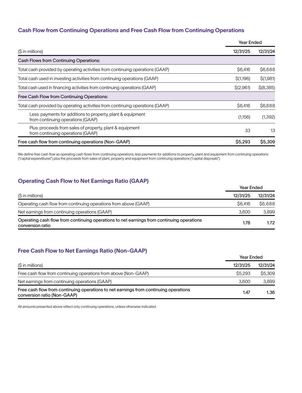 经营现金流量与净利润比率(GAAP)自由现金流量与净利润比率(Non-GAAP)除非另有说明,上述所有金额仅反映持续经营业务。截至年底(百万美元)12/31/2512/31/24来自上述持续经营业务的经营现金流(GAAP)6,416美元6,688美元来自持续经营业务的净利润(GAAP)3,6003,899来自持续经营业务的经营现金流与来自持续经营业务的净利润的转换比率1.78 1.72截至年底(百万美元)12/31/2512/31/24来自上述持续经营业务的自由现金流(Non-GAAP)5,293美元5,309美元来自持续经营业务的净利润(GAAP)3,6003,899来自持续经营业务的自由现金流与来自持续经营业务的净利润的转换比率(Non-GAAP)1.47 1.36来自持续经营业务的现金流和持续经营活动产生的自由现金流年底(百万美元)12/31/2512/31/24持续经营活动产生的现金流量:持续经营活动产生的经营活动提供的现金总额(GAAP)6,416美元6,688美元持续经营活动产生的投资活动使用的现金总额(GAAP)$(1,196)$(1,981)持续经营活动筹资活动使用的现金总额(GAAP)$(2,961)$(8,385)持续经营活动产生的自由现金流量:持续经营活动产生的经营活动提供的现金总额(GAAP)6,416美元6,688美元减:持续经营活动产生的增加物业、厂房及设备的付款(GAAP)(1,156)(1,392)加:出售物业所得款项,来自持续经营业务的厂房和设备(GAAP)3313来自持续经营业务的自由现金流(Non-GAAP)5,293美元5,309美元我们将自由现金流定义为来自持续经营业务的经营现金流,减去来自持续经营业务的增加物业、厂房和设备的付款(“资本支出”)加上来自持续经营业务的出售厂房、物业和设备的收益(“资本处置”)。