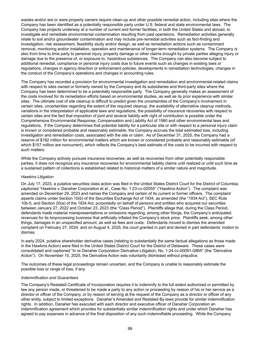 废物和/或现在或曾经是业主要求清理和其他可能的补救行动,包括公司根据美国联邦和州环境法被确定为潜在责任方的场所。该公司在美国和国外的一些现有和以前的设施中正在开展项目,以调查和修复过去运营造成的环境污染。补救活动一般涉及土壤和/或地下水污染,可能包括诸如实况调查和调查、风险评估、可行性研究和/或设计等补救前活动,以及诸如清除污染物、监测和/或安装、运行和维护较长期补救系统等补救行动。公司还不时成为私人方声称因存在或接触有害物质而造成伤害或损害的人身伤害、财产损失或其他索赔的一方。公司还可能因现有法律或法规的变化、代理方向或执法政策的变化、补救技术的发展、公司经营行为的变化和会计规则的变化等未来事件而受到额外的补救、合规或人身伤害费用的影响。对于公司及其子公司拥有或以前拥有的场地以及公司被确定为潜在责任方的第三方场地,公司已记录了一项环境调查和补救以及与环境相关的索赔的准备金。该公司通常根据环境研究,以及之前在类似地点的经验,对其补救工作所涉及的成本进行评估。鉴于公司参与某些场地的不确定性、所需清理范围的不确定性、替代清理方法的可用性、适用法律法规解释的差异、某些场地的保险赔偿的可能性以及根据1980年《综合环境响应、赔偿和责任法》和其他环境法律法规可能施加连带责任和分担权的事实,场地清理的最终成本难以预测。如果公司确定特定场地或与人身伤害索赔有关的潜在责任是已知的或被认为很可能且可合理估计的,则公司应计提与该场地或索赔相关的估计损失总额,包括调查和补救费用。截至2025年12月31日,公司有1.82亿美元的储备金,用于已知或被认为很可能且可合理估计的环境事项(其中1.57亿美元为非流动事项),这反映了公司对此类事项将产生的成本的最佳估计。公司在积极寻求保险赔偿的同时,也积极寻求其他潜在责任方的赔偿,但在实现之前或直到建立与类似性质和规模的历史事项相关的持续收款模式之前,不承认环境责任索赔的任何保险赔偿。Hawkins Litigation 2023年7月17日,一项推定的证券集体诉讼在美国哥伦比亚特区地方法院提起,标题为“Hawkins v. 丹纳赫公司 et al.,Case No. 1:23-CV-02055”(“Hawkins Action”)。该投诉于2023年12月29日进行了修订,并列举了该公司及其某些现任或前任高级管理人员的姓名。诉状声称根据经修订的《1934年证券交易法》(“1934年法案”)第10(b)节、SEC规则10b-5和1934年法案第20(a)节提出索赔,据称是代表在2022年1月27日至2023年10月23日(“集体诉讼期”)期间获得我们证券的个人和实体。原告称,在集体诉讼期间,被告就(其中包括)公司生物加工业务的预期收入作出了重大失实陈述或遗漏,从而人为地抬高了公司的股价。除其他事项外,原告寻求金额不详的损害赔偿,以及费用和成本。被告于2024年2月27日动议驳回经修正的控诉,并于2025年8月4日,法院部分批准及部分驳回被告的驳回动议。2024年初,推定的股东派生案件(涉及与霍金斯诉讼中提出的基本相同的事实指控)在美国特拉华州地区法院提起。这些案件被合并,标题为“In re 丹纳赫公司TERM0 Derivative Litigation,No. 1:24-CV-00091-GBW”(“Derivative Action”)。2025年11月10日, 派生诉讼被自愿驳回,不存在偏见。这些法律诉讼的结果仍然不确定,公司无法合理估计可能的损失或损失范围(如有)。赔偿和担保公司重述的公司注册证书要求其在法律授权或允许的最大范围内赔偿因担任公司董事或高级职员或因应公司要求担任任何其他实体的董事或高级职员而作出或威胁成为任何诉讼或程序的一方的任何人,但有限的例外情况除外。丹纳赫经修订及重述的章程亦订明类似的弥偿权。此外,丹纳赫已与丹纳赫公司的每位董事和执行官签署了一份赔偿协议,该协议提供了基本相似的赔偿权利,根据该协议,丹纳赫已同意在任何此类应予赔偿的程序的最终处置之前支付费用。而公司99