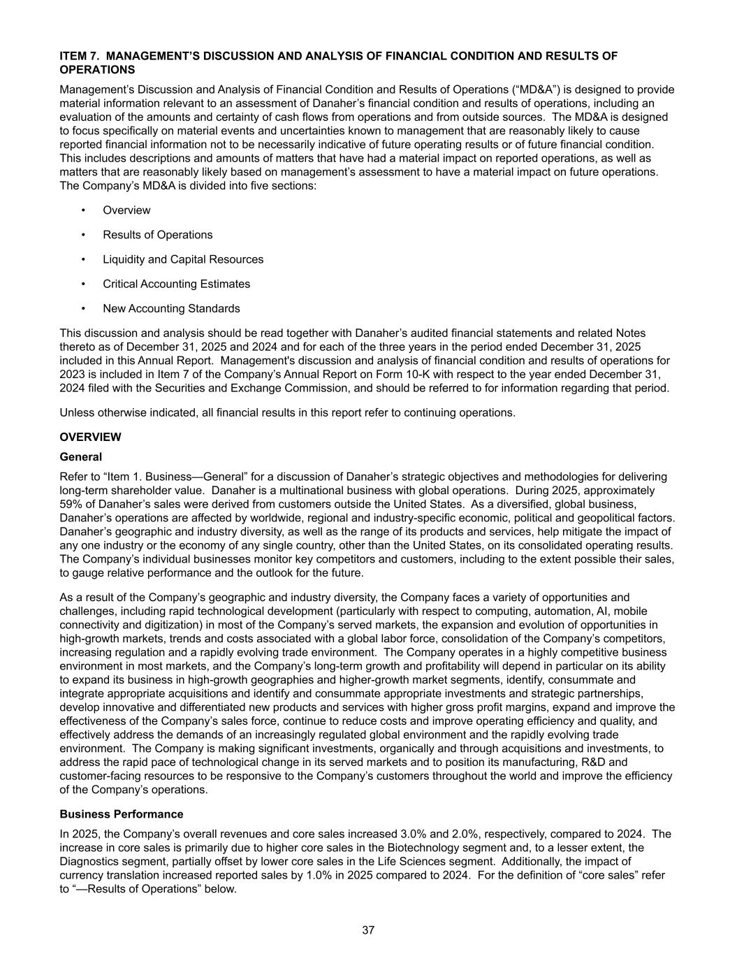 项目7。管理层对财务状况和运营结果的讨论和分析管理层对财务状况和运营结果的讨论和分析(“MD & A”)旨在提供与评估丹纳赫的财务状况和运营结果相关的重要信息,包括对来自运营和外部来源的现金流量的金额和确定性的评估。MD & A旨在专门关注管理层已知的重大事件和不确定性,这些事件和不确定性合理地可能导致报告的财务信息不一定表明未来的经营业绩或未来的财务状况。这包括对报告的业务产生重大影响的事项的说明和数额,以及根据管理层的评估合理可能对未来业务产生重大影响的事项。公司的MD & A分为五个部分:•概述•经营成果•流动性和资本资源•关键会计估计•新会计准则本讨论和分析应与本年度报告中包含的截至2025年12月31日和2024年12月31日以及截至2025年12月31日止三年期间每一年的丹纳赫经审计的财务报表及其相关附注一并阅读。管理层对2023年财务状况和经营业绩的讨论和分析包含在公司向美国证券交易委员会提交的截至2024年12月31日止年度的10-K表格年度报告的第7项中,有关该期间的信息应参考。除非另有说明,本报告中的所有财务业绩均指持续经营业务。Overview General refer to“Item 1。Business — General”,以讨论丹纳赫为股东创造长期价值的战略目标和方法。丹纳赫是一家业务遍及全球的跨国企业。2025年期间,丹纳赫约59%的销售额来自美国以外的客户。作为一家多元化、全球化的企业,丹纳赫的经营受到世界范围内、区域内和特定行业的经济、政治和地缘政治因素的影响。丹纳赫的地域和行业多样性,以及其产品和服务的范围,有助于减轻任何一个行业或任何单一国家的经济(美国除外)对其综合经营业绩的影响。该公司的个别业务监测主要竞争对手和客户,包括尽可能监测其销售情况,以衡量相对业绩和未来前景。由于公司的地域和行业多样性,公司面临各种机遇和挑战,包括公司所服务的大多数市场的快速技术发展(特别是在计算、自动化、人工智能、移动连接和数字化方面)、高增长市场机会的扩展和演变、与全球劳动力相关的趋势和成本、公司竞争对手的整合、日益严格的监管以及迅速变化的贸易环境。公司在多数市场处于竞争激烈的商业环境中运营,公司的长期增长和盈利能力将尤其取决于其在高增长地区和更高增长的细分市场扩展业务的能力,识别、完善和整合适当的收购以及识别和完善适当的投资和战略合作伙伴关系,开发具有更高毛利率的创新和差异化的新产品和服务,扩大和提高公司销售队伍的有效性,持续降低成本并提高经营效率和质量,并有效应对日益规范的全球环境和迅速演变的贸易环境的需求。公司正在进行重大投资,有机地并通过收购和投资,以应对其所服务市场的快速技术变革,并将其制造、研发和面向客户的资源定位于响应公司在世界各地的客户并提高公司运营效率。2025年业务表现,公司整体收入和核心销售额较2024年分别增长3.0%和2.0%。核心销售额的增长主要是由于生物技术部门以及在较小程度上诊断部门的核心销售额增加,部分被生命科学部门的核心销售额下降所抵消。此外,与2024年相比,货币换算的影响使2025年报告的销售额增加了1.0%。“核心销售”的定义见下文“—经营成果”。37