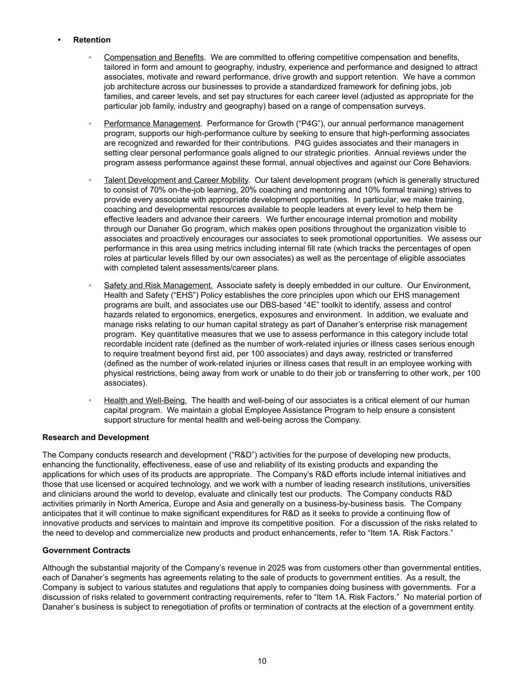•保留⑤补偿和福利。我们致力于提供有竞争力的薪酬和福利,根据地域、行业、经验和业绩在形式和金额上量身定制,旨在吸引员工、激励和奖励业绩、推动增长并支持保留。我们在所有业务中都有一个通用的工作架构,以提供一个定义工作、工作家族和职业级别的标准化框架,并根据一系列薪酬调查为每个职业级别设置薪酬结构(根据特定工作家族、行业和地理位置进行适当调整)。⑤绩效管理。Performance for Growth(“P4G”),我们的年度绩效管理计划,通过寻求确保高绩效员工的贡献得到认可和奖励来支持我们的高绩效文化。P4G指导员工及其经理制定与我们的战略优先事项相一致的明确的个人绩效目标。该计划下的年度审查根据这些正式的年度目标和我们的核心行为评估绩效。⑤人才发展和职业流动。我们的人才发展计划(其结构一般包括70%的在职学习、20%的辅导和指导以及10%的正式培训)努力为每一位员工提供适当的发展机会。特别是,我们为各级人民领袖提供培训、辅导和发展资源,帮助他们成为有效的领导者,推动他们的事业发展。我们通过我们的丹纳赫 Go计划进一步鼓励内部晋升和流动性,该计划使员工可以看到整个组织的空缺职位,并主动鼓励我们的员工寻求晋升机会。我们使用包括内部填补率(跟踪由我们自己的员工填补的特定级别的空缺职位百分比)以及已完成人才评估/职业计划的合格员工百分比在内的指标来评估我们在这一领域的表现。⑤安全和风险管理。关联安全深深植根于我们的文化之中。我们的环境、健康和安全(“EHS”)政策确立了我们的EHS管理计划所依据的核心原则,员工使用我们基于DBS的“4E”工具包来识别、评估和控制与人体工程学、能量学、暴露和环境相关的危险。此外,我们还评估和管理与人力资本战略相关的风险,作为丹纳赫企业风险管理计划的一部分。我们用来评估这一类别绩效的关键量化指标包括总可记录事故率(定义为每100名员工的工伤或疾病病例数量严重到需要急救以外的治疗)和离开、限制或转移的天数(定义为每100名员工的工伤或疾病病例数量,导致员工在身体受到限制的情况下工作、不在工作或无法完成其工作或转入其他工作)。⑤健康和福祉。员工的健康和福祉是我们人力资本计划的关键要素。我们维持一项全球员工援助计划,以帮助确保整个公司的心理健康和福祉得到一致的支持结构。研究及开发公司进行研究及开发(「研发」)活动,目的是开发新产品,增强其现有产品的功能性、有效性、易用性和可靠性,并扩大其产品的适当用途的应用。公司的研发工作包括内部举措以及那些使用许可或获得技术的举措,我们与世界各地的多家领先研究机构、大学和临床医生合作,以开发、评估和临床测试我们的产品。该公司主要在北美、欧洲和亚洲开展研发活动,一般以逐个企业为基础。该公司预计,由于寻求提供持续的创新产品和服务,以保持和提高其竞争地位,它将继续在研发方面进行大量支出。关于与开发和商业化新产品和产品增强的需要相关的风险的讨论,请参阅“第1a项。风险因素。”政府合同尽管公司2025年的大部分收入来自政府实体以外的客户,但丹纳赫的每个分部都有与向政府实体销售产品有关的协议。因此,公司受适用于与政府开展业务的公司的各种法规和法规的约束。对于政府签约要求相关风险的讨论, 请参阅“第1a项。风险因素。”丹纳赫业务的任何重大部分都不会因政府实体的选举而就利润进行重新谈判或终止合同。10