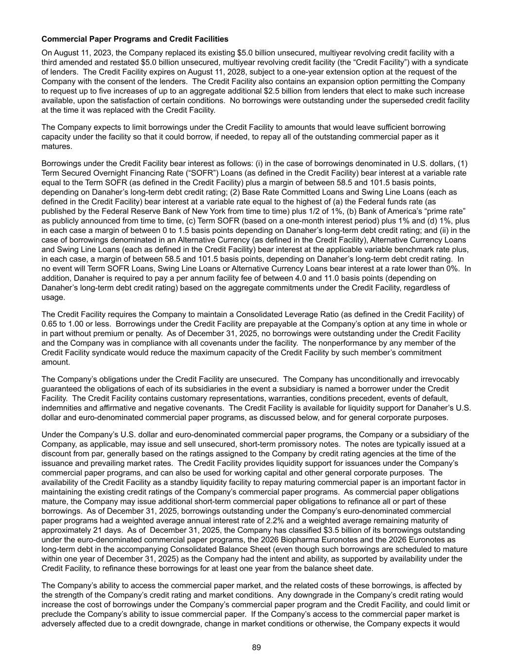 商业票据计划和信贷便利2023年8月11日,公司将其现有的50亿美元无担保、多年期循环信贷便利替换为第三笔经修订和重述的50亿美元无担保、多年期循环信贷便利(“信贷便利”),由贷款人组成的银团。信贷融通将于2028年8月11日到期,但须经贷款人同意,根据公司的要求提供一年的延期选择权。该信贷融通还包含一项扩展选项,允许公司在满足某些条件后,向选择提供此类增加的贷方请求最多五次增加,总计最多额外25亿美元。在被取代的信贷融资被替换为信贷融资时,没有未偿还的借款。该公司预计将把信贷融资下的借款限制在将在该融资下留下足够借贷能力的金额,以便在需要时可以借款,以在到期时偿还所有未偿还的商业票据。信贷融通下的借款按以下方式计息:(i)就以美元计价的借款而言,(1)定期有担保隔夜融资利率(“SOFR”)贷款(定义见信贷融通)按等于定期SOFR(定义见信贷融通)的可变利率加上58.5至101.5个基点之间的保证金计息,取决于丹纳赫的长期债务信用评级;(2)基准利率承诺贷款和周转额度贷款(每一种都在信贷安排中定义)的浮动利率等于(a)联邦基金利率(由纽约联邦储备银行不时公布)加上1%的1/2,(b)美国银行不时公布的“最优惠利率”,(c)定期SOFR(基于一个月的利息期)加上1%和(d)1%中的最高者,在每种情况下加上0至1.5个基点的保证金,具体取决于丹纳赫的长期债务信用评级;(ii)就以替代货币(定义见信贷便利)计值的借款而言,替代货币贷款和周转额度贷款(定义见信贷便利)按适用的可变基准利率计息,在每种情况下加上58.5至101.5个基点的保证金,具体取决于丹纳赫的长期债务信用评级。在任何情况下,定期SOFR贷款、周转额度贷款或替代货币贷款的利率都不会低于0%。此外,无论使用何种方式,丹纳赫均需根据信贷融通下的总承诺支付每年4.0至11.0个基点的融通费(取决于丹纳赫的长期债务信用评级)。信贷便利要求公司维持0.65至1.00或更低的综合杠杆率(定义见信贷便利)。信贷融通项下的借款可由公司选择在任何时间全部或部分预付,无需溢价或罚款。截至2025年12月31日,信贷融资项下无未偿还借款,公司遵守该融资项下的所有契诺。信贷融通银团任何成员的不履约行为将减少信贷融通的最大容量,减少该成员的承诺金额。公司在信贷融通下的债务是无抵押的。在附属公司被指定为信贷融通项下的借款人的情况下,公司已无条件及不可撤销地为其各附属公司的义务提供担保。信贷融通包含惯常的陈述、保证、先决条件、违约事件、赔偿以及肯定和否定契约。该信贷便利可用于向丹纳赫的美元和欧元计价商业票据计划提供流动性支持,如下文所述,并用于一般公司用途。根据公司的美元和欧元计价商业票据计划,公司或公司的子公司(如适用)可发行和出售无担保的短期本票。这些票据通常以低于面值的价格发行,一般基于发行时信用评级机构授予公司的评级和现行市场利率。信贷融通为公司商业票据计划下的发行提供流动性支持,也可用于营运资金和其他一般公司用途。信贷便利作为偿还到期商业票据的备用流动性便利的可用性是维持公司商业票据计划现有信用评级的重要因素。随着商业票据债务到期,公司可能会发行额外的短期商业票据债务,以对这些借款的全部或部分进行再融资。截至2025年12月31日, 公司欧元计价商业票据计划下未偿还借款的加权平均年利率为2.2%,加权平均剩余期限约为21天。截至2025年12月31日,公司在随附的综合资产负债表中将欧元计价商业票据计划、2026年生物制药Euronotes和2026年Euronotes下的未偿还借款中的35亿美元归类为长期债务(即使这些借款计划在2025年12月31日的一年内到期),因为公司有意图和能力,并得到信贷融通下的可用性的支持,从资产负债表日起至少一年内为这些借款再融资。公司进入商业票据市场的能力,以及这些借款的相关成本,受到公司信用评级强度和市场状况的影响。公司信用评级的任何下调将增加公司商业票据计划和信贷便利下的借款成本,并可能限制或排除公司发行商业票据的能力。如果公司的商业票据市场准入因信用降级、市场条件变化或其他原因而受到不利影响,公司预计将89