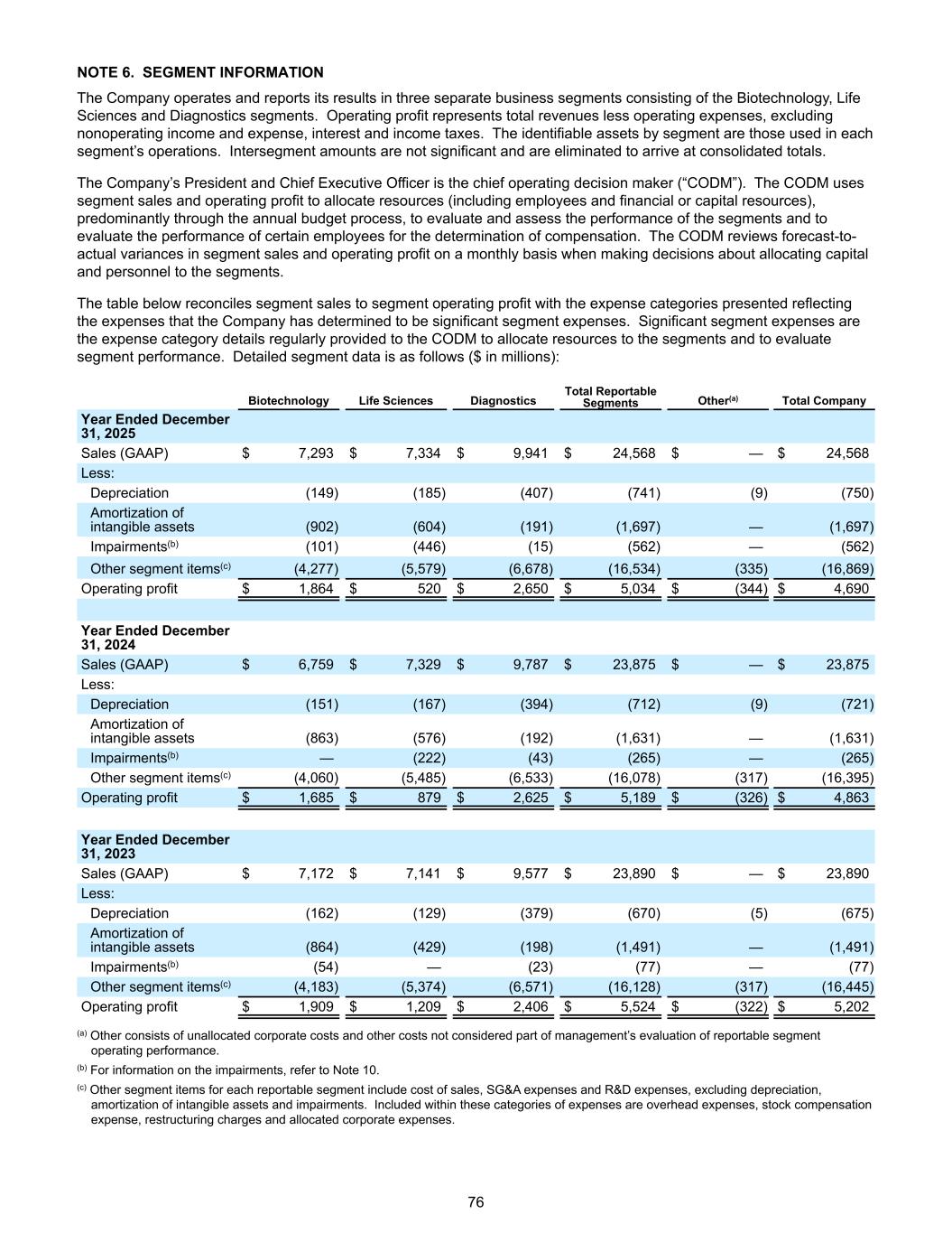 注6。分部信息该公司在三个独立的业务部门运营并报告其业绩,这些业务部门包括生物技术、生命科学和诊断部门。营业利润指总收入减去营业费用,不包括营业外收入和费用、利息和所得税。按分部划分的可辨认资产为各分部业务中使用的资产。分部间金额不大,将其剔除以得出合并总额。公司总裁兼首席执行官为首席运营决策者(“CODM”)。主要经营决策者利用分部销售额和经营利润分配资源(包括雇员和财务或资本资源),主要通过年度预算流程,评估和评估分部的业绩,并评估某些雇员的业绩,以确定薪酬。主要经营决策者在作出有关向分部分配资本和人员的决策时,每月审查分部销售额和营业利润的预测与实际差异。下表将分部销售额与分部营业利润与列报的费用类别进行了核对,这些费用类别反映了公司确定为重大分部费用的费用。重大分部开支是指定期向主要经营决策者提供的开支类别详情,以分配资源予分部及评估分部表现。详细分部数据如下(百万美元):Biotechnology Life Sciences Diagnostics可报告分部总额其他(a)截至2025年12月31日的公司年度总销售额(GAAP)7,293美元7,334美元9,941美元24,568美元— 24,568美元减:折旧(149)(185)(407)(741)(9)(750)无形资产摊销(902)(604)(191)(1,697)—(1,697)减值(b)(101)(446)(15)(562)—(562)其他分部项目(c)(4,277)(5,579)(6,678)(16,534)(335)(16,869)营业利润$ 1,864 $ 520 $ 2,650 $ 52024年销售额(GAAP)6,759美元7,329美元9,787美元23,875美元— 23,875美元减:折旧(151)(167)(394)(712)(9)(721)无形资产摊销(863)(576)(192)(1,631)—(1,631)减值(b)—(222)(43)(265)—(265)其他分部项目(c)(4,060)(5,485)(6,533)(16,078)(317)(16,395)营业利润1,685美元879美元2,625美元5,189美元(326)4,863美元截至12月31日止年度,2023年销售额(GAAP)7,172美元7,141美元9,577美元23,890美元— 23,890美元减:折旧(162)(129)(379)(670)(5)(675)无形资产摊销(864)(429)(198)(1,491)—(1,491)减值(b)(54)—(23)(77)—(77)其他分部项目(c)(4,183)(5,374)(6,571)(16,128)(317)(16,445)营业利润1,909美元1,209美元2,406美元5,524美元(322)5,202美元(a)其他包括未分配的公司成本和其他成本,这些成本未被视为管理层对可报告分部经营业绩评估的一部分。(b)有关减值的资料,请参阅附注10。(c)每个可报告分部的其他分部项目包括销售成本、SG & A费用和研发费用,不包括折旧、无形资产摊销和减值。这些类别的费用中包括间接费用、股票补偿费用、重组费用和分配的公司费用。76