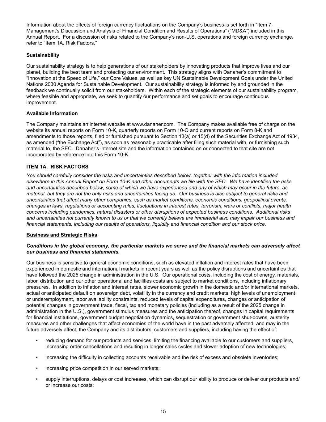 有关外汇波动对公司业务影响的信息载于“第七项。管理层对财务状况和经营成果的讨论与分析”(“MD & A”)载入本年度报告。有关公司非美国业务和外汇兑换相关风险的讨论,请参阅“第1A项。风险因素。”可持续发展我们的可持续发展战略是通过创新改善生活和地球的产品、建立最好的团队和保护我们的环境来帮助我们几代利益相关者。这一战略符合丹纳赫对“以生活速度创新”的承诺、我们的核心价值观,以及联合国2030年可持续发展议程下的联合国可持续发展关键目标。我们的可持续发展战略以我们不断征求利益相关者的反馈为依据,并以此为基础。在我们可持续发展计划的每个战略要素中,在可行和适当的情况下,我们寻求量化我们的绩效并设定目标以鼓励持续改进。可用信息公司在www.danaher.com上维护一个互联网网站。公司在向SEC提交或向SEC提供此类材料后,在合理可行的范围内尽快在网站上免费提供根据经修订的1934年证券交易法(“交易法”)第13(a)或15(d)条提交或提供的10-K表格年度报告、10-Q表格季度报告和8-K表格当前报告以及对这些报告的修订。丹纳赫的网站以及该网站上包含或与之相关的信息未通过引用并入本10-K表格。项目1A。风险因素您应该仔细考虑下文所述的风险和不确定性,以及本年度报告中其他地方包含的10-K表格信息以及我们向SEC提交的其他文件。我们已将下文所述的风险和不确定性(其中一些我们已经经历过,其中任何一项可能在未来发生)确定为重大风险和不确定性,但它们并不是我们面临的唯一风险和不确定性。我们的业务还受到影响许多其他公司的一般风险和不确定性的影响,例如市场状况、经济状况、地缘政治事件、法律、法规或会计规则的变化、利率波动、恐怖主义、战争或冲突、包括流行病在内的重大健康问题、自然灾害或预期业务状况的其他中断。我们目前不知道或我们目前认为不重要的其他风险和不确定性也可能损害我们的业务和财务报表,包括我们的经营业绩、流动性和财务状况以及我们的股价。业务和战略风险全球经济、我们所服务的特定市场和金融市场的状况可能会对我们的业务和财务报表产生不利影响。我们的业务对总体经济状况很敏感,例如近年来国内和国际市场经历的通胀和利率上升,以及2025年美国政府更迭后的政策中断和不确定性。我们的运营成本,包括能源、材料、劳动力、分销成本以及我们的其他运营和设施成本受制于市场条件,包括通胀压力。除了通货膨胀和利率之外,国内和/或国际市场的经济增长放缓、主权债务的实际或预期违约、货币和信贷市场的波动、高失业率或就业不足、劳动力供应受限、资本支出水平降低、政府贸易、财政、税收和货币政策的变化或预期的潜在变化(包括由于美国2025年行政管理的变化)、政府刺激措施及其预期、金融机构资本要求的变化、政府预算谈判动态、封存或政府关闭,影响世界各国经济的紧缩措施和其他挑战在过去曾对公司及其分销商、客户和供应商产生不利影响,并可能在未来产生不利影响,包括产生以下影响:•减少对我们的产品和服务的需求,限制我们的客户和供应商可获得的融资,增加订单取消并导致更长的销售周期和更慢的新技术采用;•增加应收账款回收的难度以及库存过剩和过时的风险;•在我们所服务的市场中加剧价格竞争;•供应中断,延迟或成本增加,这可能会扰乱我们生产或交付产品的能力和/或增加我们的成本;15