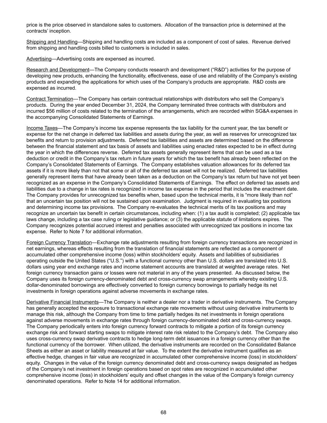 价格是在单独销售给客户时观察到的价格。交易价格的分配在合同开始时确定。运输和装卸——运输和装卸费用作为销售成本的组成部分包括在内。来自向客户开票的运输和装卸费用的收入包含在销售额中。广告——广告费用在发生时计入费用。研发—公司进行研发(“研发”)活动的目的是开发新产品,增强公司现有产品的功能性、有效性、易用性和可靠性,并扩大公司产品适合其用途的应用。研发费用在发生时计入费用。合同终止——公司与销售公司产品的经销商存在一定的合同关系。截至2024年12月31日止年度,公司终止了与分销商的三份合同,并产生了与终止安排相关的5600万美元成本,这些成本在随附的综合收益表的SG & A费用中记录。所得税——公司的所得税费用代表当年的纳税义务、当年递延所得税负债和资产净变动的税收优惠或费用,以及未确认的税收优惠准备金和返还拨备调整。递延税项负债和资产是根据资产和负债的财务报表和计税基础之间的差异,使用预期在差异逆转当年有效的已颁布税率确定的。递延税项资产一般指可在公司未来年度的纳税申报表中作为税收减免或抵免的项目,其税收优惠已反映在公司的综合收益表中。如果递延所得税资产的部分或全部很可能无法实现,公司将为其递延所得税资产建立估值备抵。递延税项负债一般指已在公司的纳税申报表中作为扣除但尚未在公司的综合收益表中确认为费用的项目。因税率变动对递延所得税资产和负债的影响在包括颁布日期的期间内确认为所得税费用。当基于技术优势,不确定的税务状况“很可能”经审查后将无法持续时,公司会提供未确认的税收优惠。在评估税收状况和确定所得税准备金时需要进行判断。公司重新评估其税务状况的技术优势,并可能在某些情况下确认不确定的税收优惠,包括在以下情况下:(1)完成税务审计;(2)适用的税法发生变化,包括税务案件裁决或立法指导;或(3)适用的诉讼时效到期。公司在所得税费用中确认与未确认的税务头寸相关的潜在应计利息和罚款。有关更多信息,请参阅附注7。外币换算——外币交易产生的汇率调整在净收益中确认,而财务报表换算产生的影响在股东权益中作为累计其他综合收益(损失)的组成部分反映。以美元以外的功能货币在美国境外经营的子公司(“美国”)的资产和负债采用年终汇率换算成美元,损益表账户采用加权平均汇率换算。外币交易净收益或损失在所列的任何年份都不是重大的。如下文所述,公司利用其外币计价债务和交叉货币互换安排,将现有的美元计价借款有效转换为外币借款,以部分对冲其海外业务的净投资,以应对汇率的不利变动。衍生金融工具——公司既不是衍生工具的交易商,也不是交易商。该公司普遍接受了交易型汇率变动的风险敞口,而没有使用衍生工具来管理这一风险, 尽管该公司不时通过外币计价债务和交叉货币掉期部分对冲其海外业务的净投资,以应对汇率的不利变动。公司定期订立外币远期合约以减轻部分外币兑换风险,远期启动掉期以减轻与公司债务相关的利率风险。该公司还使用交叉货币掉期衍生品合约对借款人功能货币以外的外币长期债务发行进行套期保值。使用时,衍生工具在综合资产负债表中作为以公允价值计量的资产或负债入账。在衍生工具符合有效套期条件的范围内,公允价值变动计入累计其他综合收益(损失)的股东权益。根据即期汇率对公司境外经营净投资指定为套期保值的外币计价债务和交叉货币掉期的价值变动,在股东权益累计其他综合收益(损失)中确认,并冲减公司外币计价经营的价值变动。有关更多信息,请参阅附注14。68