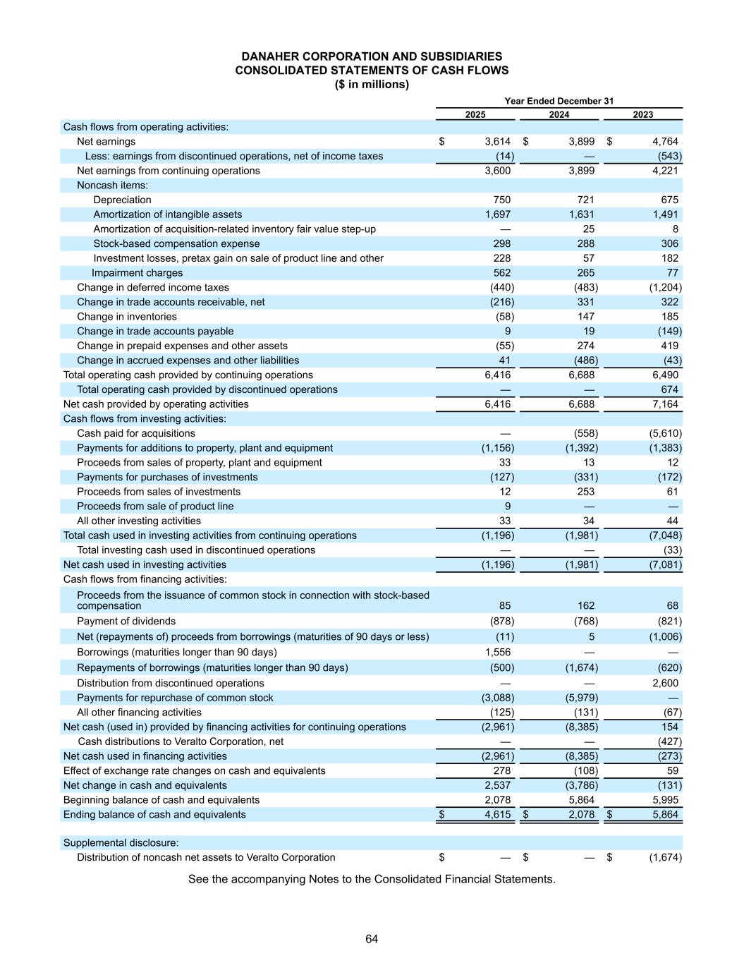 DANAHER CORPORATION及其子公司合并现金流量表(百万美元)截至2025年12月31日的年度20242023经营活动产生的现金流量:净收益3,614美元3,899美元4,764美元减:已终止经营业务的收益,扣除所得税(14)—(543)持续经营业务的净收益3,6003,8994,221非现金项目:折旧750721675无形资产摊销1,6971,6311,491摊销与收购相关的存货公允价值提升— 258基于股票的补偿费用298288306投资损失,出售产品线和其他的税前收益22857182减值费用56226577递延所得税变化(440)(483)(1,204)贸易应收账款变化,净额(216)331322存货变动(58)147185应付贸易账款变动919(149)预付费用和其他资产变动(55)274419应计费用和其他负债变动41(486)(43)持续经营提供的经营现金总额6,4166,6886,490已终止经营提供的经营现金总额—— 674经营活动提供的现金净额6,4166,6887,164投资活动产生的现金流量:购置支付的现金——(558)(5,610)增加物业、厂房及设备的付款(1,156)(1,392)(1,383)出售物业所得款项,植物和设备331312付款购买投资(127)(331)(172)出售投资收益1225361出售产品线9的收益——所有其他投资活动333444持续经营业务投资活动使用的现金总额(1,196)(1,981)(7,048)已终止经营业务使用的投资现金总额——(33)投资活动使用的现金净额(1,196)(1,981)(7,081)筹资活动产生的现金流量:与股票补偿有关的发行普通股所得款项8516268支付股息(878)(768)(821)借款所得款项净额(偿还)(期限90天(11)5(1,006)借款(期限长于90天)1,556 ——偿还借款(期限长于90天)(500)(1,674)(620)终止经营的分配—— 2,600普通股回购付款(3,088)(5,979)——所有其他筹资活动(125)(131)(67)筹资活动为持续经营提供的现金净额(用于)(2,961)(8,385)154向Veralto Corporation的现金分配,净额——(427)筹资活动使用的现金净额(2,961)(8,385)(273)汇率变动对现金及等价物的影响278(108)59现金及等价物净变动2,537(3,786)(131)现金及等价物期初余额2,0785,8645,995现金及等价物期末余额4,615美元2,078美元5,864美元补充披露:向Veralto Corporation分配非现金净资产$ — $ —(1,674)见合并财务报表附注。64
