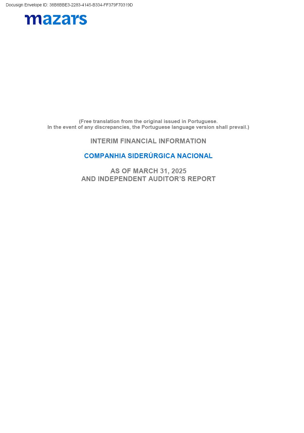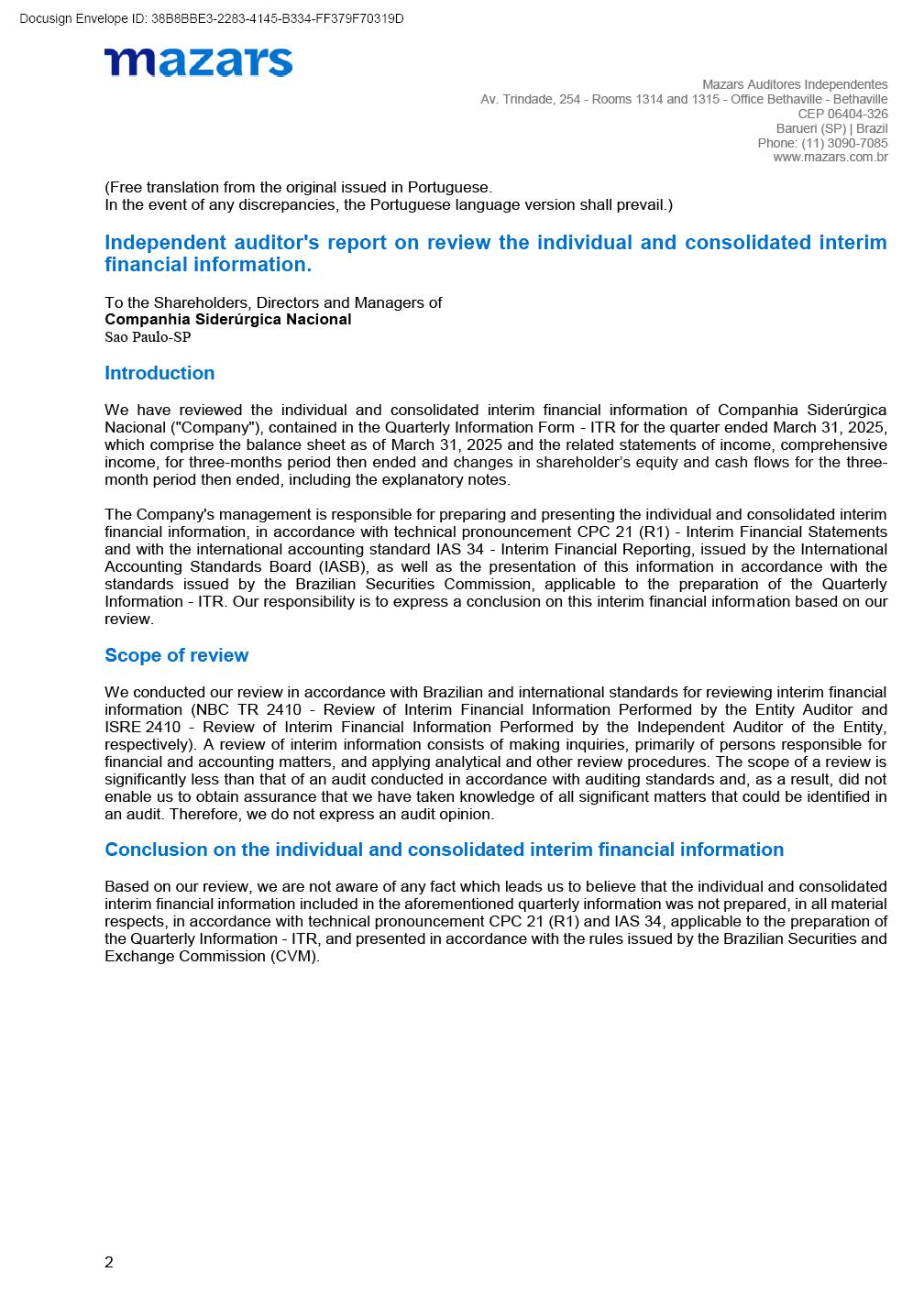 docusign信封ID:38b8BBE3-2283-4145-b334-FF379f70319D Mazars Auditores Independentes AV。Trindade,254-Rooms 1314 and 1315-Office Bethaville-Bethaville CEP 06404-326 Barueri(SP)|巴西电话:(11)3090-7085 www.mazars.com. br(免费翻译自葡萄牙文发行的原件。如有差异,以葡萄牙语版本为准。)2独立核数师关于复核个别及综合中期财务资料的报告。致Companhia Sider ú rgica Nacional Sao Paulo-SP的股东、董事和管理人员简介我们已审阅Companhia Sider ú rgica Nacional(“公司”)的个别和综合中期财务信息,载于截至2025年3月31日的季度信息表-ITR,其中包括截至2025年3月31日的资产负债表和相关的收益、综合收益、然后结束的三个月期间的报表以及当时结束的三个月期间的股东权益和现金流量变动,包括解释性说明。公司管理层负责根据国际会计准则理事会(IASB)发布的技术公告CPC21(R1)-中期财务报表和国际会计准则IAS34-中期财务报告,以及根据巴西证券委员会发布的适用于编制季度信息-ITR的标准编制和列报这些信息的个别和合并的中期财务信息。我们的责任是根据我们的审查对这一中期财务信息作出结论。审查范围我们根据巴西和国际中期财务信息审查标准(NBC TR2410-由实体审计员执行的中期财务信息审查和ISRE2410-分别由实体独立审计员执行的中期财务信息审查)进行了审查。对临时信息的审查包括进行查询,主要是对负责财务和会计事项的人员进行查询,并应用分析和其他审查程序。审查的范围明显小于根据审计准则进行的审计,因此,我们无法获得保证,即我们已了解审计中可能发现的所有重大事项。因此,我们不发表审计意见。关于个别和综合中期财务信息的结论根据我们的审阅,我们并不知悉任何事实导致我们认为上述季度信息中包含的个别和综合中期财务信息在所有重大方面均未按照适用于编制季度信息-ITR的技术公告CPC 21(R1)和IAS 34编制,并未按照巴西证券交易委员会(CVM)发布的规则呈报。