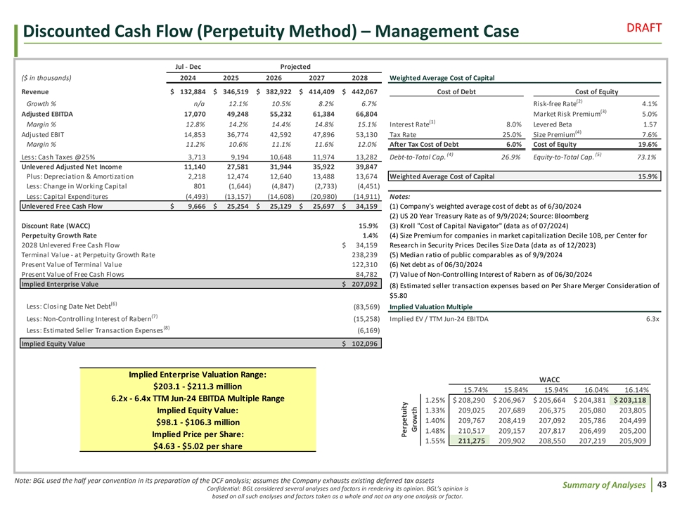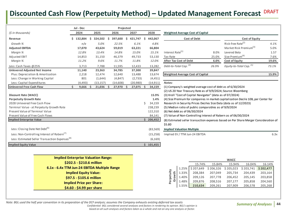 贴现现金流草案(永续法)–更新的管理层预测7月至12月预计(千美元)20242025202620272028加权平均资本成本收入132,884美元324,502美元397,600美元421,747美元442,067美元债务成本权益成本(2)增长% n/a 5.0% 22.5% 6.1% 4.8%无风险率4.1%(3)调整后EBITDA 17,07043,62459,01963,22166,804市场风险溢价5.0%(1)保证金率% 12.8% 13.4% 14.8% 15.0% 15.1%利率8.0%杠杆贝塔1.57(4)调整后息税前利润14,85331,15046,37949,73353,130税率25.0%规模溢价7.6%保证金% 11.2% 9.6% 11.7% 11.8% 12.0%税后债务成本6.0%权益成本19.6%(4)(5)减:现金税@25% 3,7137,78811,59512,43313,282债务总额上限。26.9%股本总额上限。73.1%无杠杆调整后净收入11,14023,36334,78537,30039,847加:折旧和摊销2,21812,47412,64013,48813,674加权平均资本成本15.9%减:营运资本变动801(1,644)(4,847)(2,733)(4,451)减:资本支出(4,493)(13,157)(14,608)(20,980)(14,911)注:无杠杆自由现金流9美元666美元21,036美元27,970美元27,075美元34,159美元(1)公司截至2024年6月30日的加权平均债务成本(2)美国20年期国债利率截至2024年9月9日;资料来源:彭博贴现率(WACC)15.9%(3)Kroll Cost of Capital Navigator(数据截至07/2024)永续增长率1.4%(4)市值十分位10B公司的规模溢价,每个中心2028年无杠杆自由现金流34,159美元研究证券价格十分位规模数据(数据截至12/2023)终值-按永续增长率计算238,239(5)截至2024年9月9日的公开可比比率中位数终值现值122,310(6)截至2024年6月30日的净债务自由现金流现值84,141(7)Rabern非控股权益价值截至2024年6月30日隐含企业价值$ 206,452(8)基于每股合并对价$ 5.80的估计卖方交易费用(6)减:截止日期净债务(83,569)隐含估值倍数(7)减:非控股权益Rabern(15,258)隐含EV/TTM Jun-24 EBITDA 6.3x(8)减:估计卖方交易费用(6,169)隐含股权价值$ 101,455隐含企业估值范围:WACC $ 202.5-$ 2.106亿# # # # # 15.74% 15.84% 15.94% 16.04% 16.14% 6.1x-6.4x TTM Jun-24 EBITDA倍数范围1.25% $ 207,649 $ 206,326 $ 205,023 $ 203,741 $ 202,477隐含205,734204,439203,1641.40% 209,126207,778206,452205,145203,858 $ 97.5-$ 105.6 million 1.48% 209,876208,516207,177205,858204,560每股隐含价格:1.55% 210,634209,261207,909206,578205,268 $ 4.60-$ 4.99 per share注:BGLL在编制DCF分析时使用了半年惯例;假设公司用尽现有递延所得税资产44分析摘要机密:BGLL在发表意见时考虑了若干分析和因素。BGL的意见是基于所有这些分析和因素作为一个整体,而不是基于任何一个分析或因素。永续增长