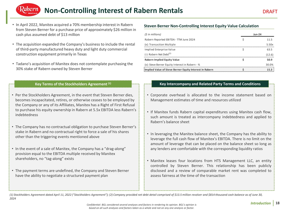 Rabern Rentals非控股权益草案• 2022年4月,Manitex从Steven Berner收购Rabern Steven Berner 70%的会员权益非控股权益股权价值计算,购买价格约为2600万美元(百万美元)Jun-24现金加上承担的1300万美元债务Rabern报告的EBITDA-TTM 2024年6月11.5美元•此次收购扩大了公司的业务范围,包括出租(x):交易倍数5.50x的第三方制造重型和轻型商用隐含企业价值63.5美元(2)主要在德克萨斯州的建筑设备(-):Rabern净债务(12.6)Rabern隐含股权价值50.9美元• Tadano收购Manitex不考虑购买(x):Steve Berner在Rabern的股权-Steven Berner拥有的Rabern的30.0% 30%股权隐含价值Steve Berner在Rabern的股权15.3美元(1)关键的公司间和关联方条款和股东协议的关键条款•根据股东协议,如果Steven Berner去世,•公司间接费用根据丧失行为能力、退休或以其他方式停止使用的情况分配到损益表,管理层估计公司或其任何关联公司使用的时间和资源,Manitex有权优先拒绝以5.5倍EBITDA减去Rabern的价格购买他在Rabern的股权•如果Manitex使用Manitex现金流为Rabern资本支出提供资金,债务此类金额被视为公司间债务,并适用于Rabern的资产负债表•公司没有购买Steven Berner在Rabern的股份的合同义务,也没有强制出售其股份的合同权利•在利用Manitex资产负债表方面,公司有能力利用除上述触发事件之外的Manitex EBITDA的全部现金流。对资产负债表上可以设置的杠杆数量没有限制,只要•在出售Manitex的情况下,公司有一个“拖后腿”,任何贷方都对等于Manitex股东收到的EBITDA倍数的相应流动性比率拨备感到满意,不存在“跟随”• Manitex从Steven Berner控制的实体HTS Management LLC租赁四个地点。这一关系已公开•付款条款未定义,公司和Steven Berner披露,已完成对可比市场租金的审查,以便有能力就结构性付款计划进行谈判,以评估交易时的公平性(1)日期为2022年4月11日的股东协议(“股东协议”);(2)公司提供了截至2024年6月30日的净债务细节,包括1350万美元的左轮手枪和81.4万美元的现金余额18简介机密:BGL在发表意见时考虑了几项分析和因素。BGL的意见是基于所有这些分析和因素作为一个整体,而不是基于任何一个分析或因素。