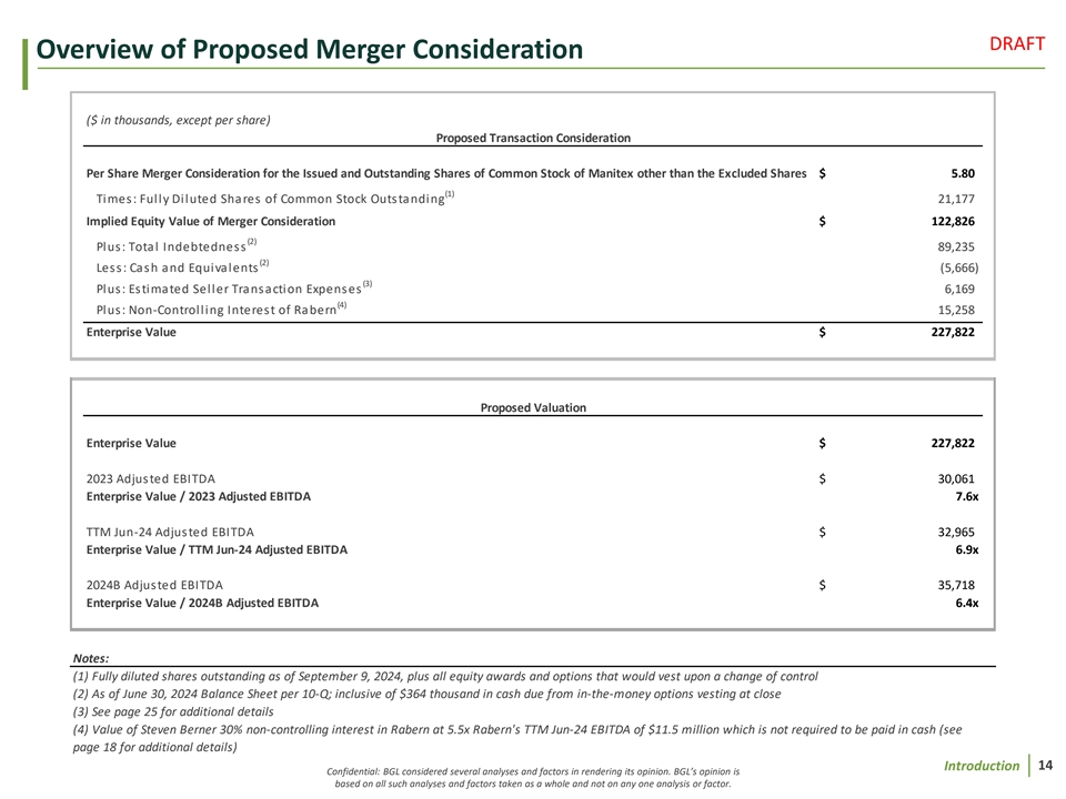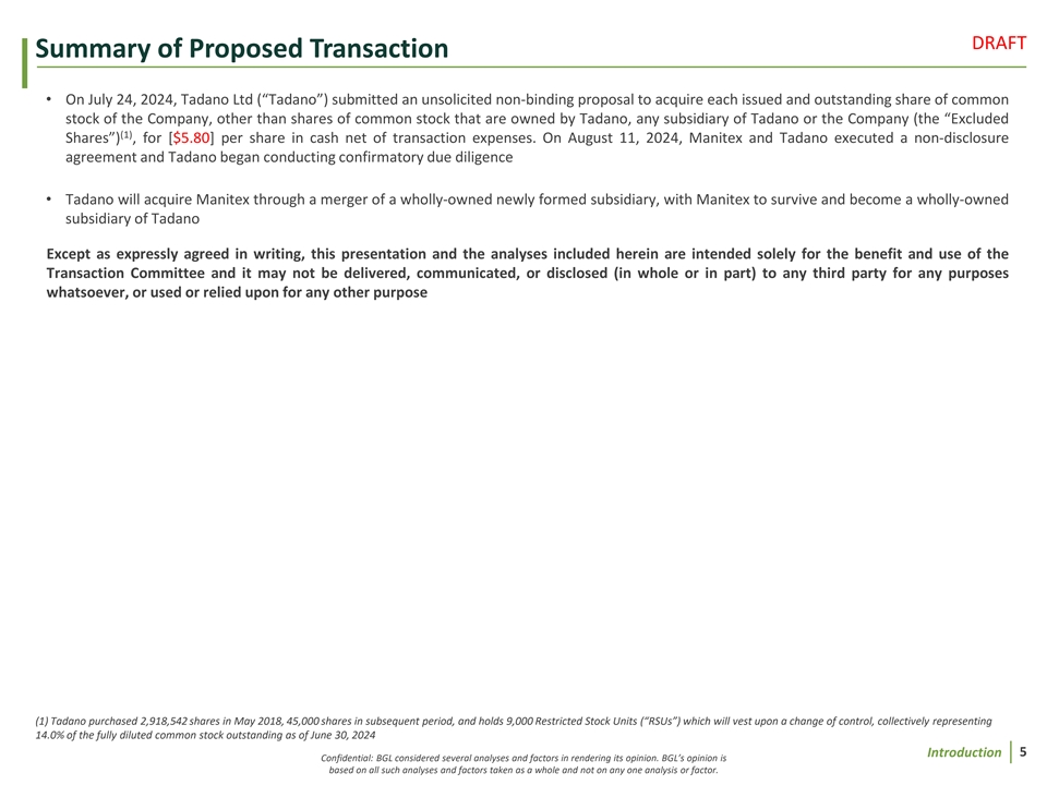 拟议交易草案摘要• 2024年7月24日,Tadano Ltd(“Tadano”)主动提交了一份非约束性提案,以每股[ 5.80美元]的现金(扣除交易费用)收购公司的每一股已发行和流通在外的普通股,但Tadano、Tadano的任何子公司或公司拥有的普通股股份(“不包括(1)股”)除外。2024年8月11日,Manitex和Tadano签署了保密协议,Tadano开始进行确认性尽职调查• Tadano将通过合并一家新成立的全资子公司来收购Manitex,Manitex将存续并成为Tadano的全资子公司,除非书面明确同意,本演示文稿和此处包含的分析仅旨在为交易委员会的利益和使用,不得出于任何目的向任何第三方交付、传达或披露(全部或部分),或用于或依赖于任何其他目的(1)Tadano于2018年5月购买了2,918,542股,后续期间购买了45,000股,并持有9,000个将在控制权变更时归属的限制性股票单位(“RSU”),合计占截至2024年6月30日已发行完全稀释普通股的14.0% 5简介机密:BGLL在发表意见时考虑了几项分析和因素。BGL的意见是基于所有这些分析和因素作为一个整体,而不是基于任何一个分析或因素。