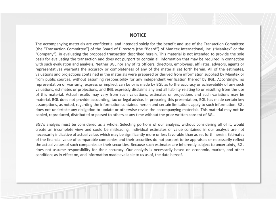 注意,随附的材料是保密的,仅供Manitex International, Inc.(“Manitex”或“公司”)董事会(“董事会”)的交易委员会(“交易委员会”)在评估此处描述的拟议交易时使用。本材料无意提供评估交易的唯一依据,也无意包含与此种评估和分析相关的可能需要的所有信息。BGL或其任何高级职员、董事、雇员、关联公司、顾问、代理人或代表均不保证本文所述任何材料的准确性或完整性。材料中包含的所有估计、估值和预测都是根据Manitex提供的信息或公共来源编制或得出的,不承担BGL对此进行任何独立核查的责任。因此,BGL不能或不对任何此类估值、估计或预测的准确性或可实现性作出任何明示或暗示的陈述或保证,BGL明确表示不承担与使用本材料有关或因使用本材料而产生的任何和所有责任。实际结果可能与此类估值、估计或预测不同,此类差异可能是重大的。BGLL不提供会计、税务或法律咨询。如前所述,在准备本演示文稿时,BGL对此处包含的信息做出了某些关键假设,并且某些限制适用于此类信息。BGLL不承担更新或以其他方式修改随附材料的任何义务。未经BGL事先书面同意,不得随时复制、复制、分发或传递给他人。BGL的分析必须作为一个整体来考虑。选择我们分析的部分,而不考虑所有部分,将造成不完整的观点,并可能产生误导。我们的分析中所包含的价值的个别估计不一定代表实际价值,这可能比本文所述的要明显更有利或更不利。对可比公司及其证券的财务价值的估计并不旨在作为评估或必然反映此类公司或其证券的实际价值。由于此类估计在本质上受到不确定性的影响,BGL不对其准确性承担责任。我们的分析必然是基于经济、市场和其他条件生效,以及截至本协议日期向我们提供的信息。