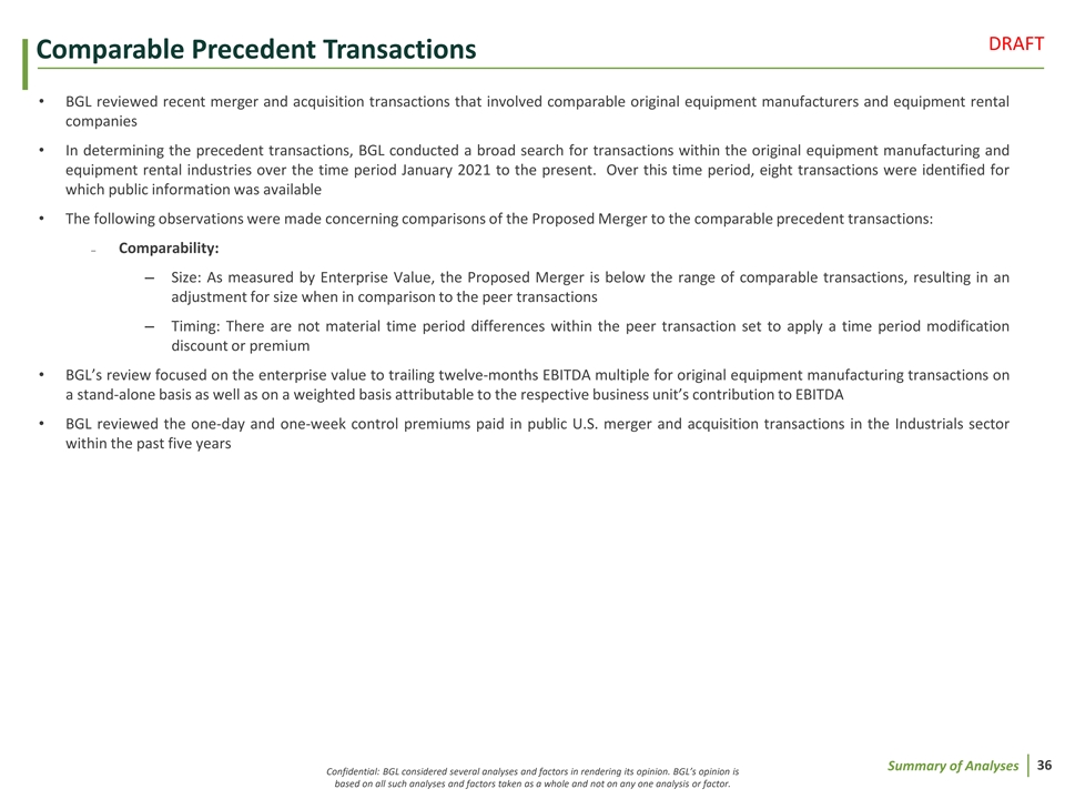 可比上市公司草案–零部件估值摘要之和可比公共原始设备制造商可比公共设备租赁EV与TTM中值(1)(1)EV与TTM EBITDA倍数范围中值EBITDA倍数范围(以千美元计)(2.0%)中值2.0%(2.0%)中值2.0% 5.3x 5.4x 5.5x 6.9x 7.0x 7.2x TTM 2024年6月EBITDA归属于OEM业务的EBITDA 丨TTM 2024年6月EBITDA归属于租赁业务的EBITDA 21,419美元11,546% EBITDA归属于OEM业务% EBITDA归属于租赁业务65.0% 35.0% OEM业务隐含EV隐含租赁业务EV 113,301美元117,926美元79,471美元82,715美元隐含企业价值区间隐含EV区间前(折价)/溢价192,772美元200,641美元(2)控制权溢价28.9% 28.9%(3)流动性折价(14.8%)(14.8%)(4)可比性折价(7.6%)(7.6%)总(折价)/溢价6.5% 6.5%隐含企业价值205,225美元213,602美元(5)每股隐含价值4.73美元5.13美元隐含调整后EBITDA倍数区间6.2x 6.5x Manitex企业价值区间:205.2美元-2.136亿美元6.2x-6.5x调整后TTM 2024年6月EBITDA隐含股份价值区间:每股4.73美元-5.13美元注:(1)区间等于中位倍数加上或负2.0%(2)基于最近五年内公布的工业企业在美国公开交易中的1天控制权溢价(3)资料来源:达夫菲尔普斯股票、债券、票据和通货膨胀2021(4)市值十分位10B的公司的规模溢价,根据证券价格十分位规模数据研究中心(数据截至12/2023)(5)假设截至2024年6月30日的净债务为8360万美元,Rabern的非控股权益为1530万美元,估计卖方交易费用为620万美元,截至2024年9月9日,在完全稀释的基础上发行的普通股为2120万股35分析摘要机密:BGL在发表意见时考虑了几项分析和因素。BGL的意见是基于所有这些分析和因素作为一个整体,而不是基于任何一个分析或因素。