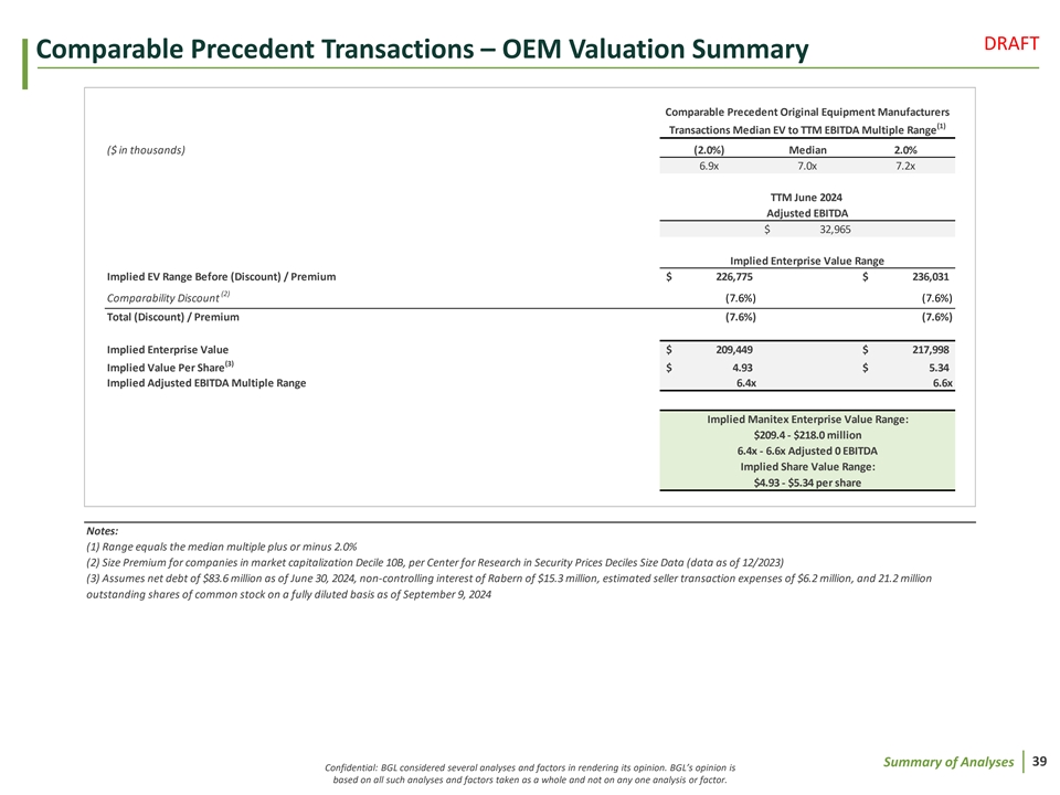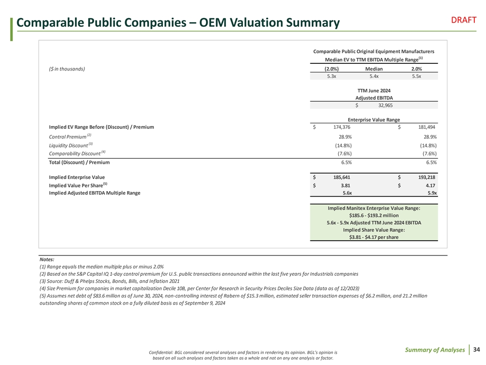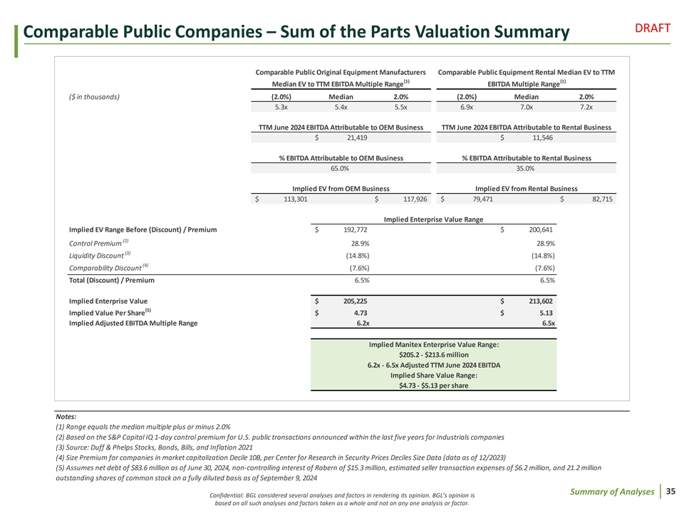 可比上市公司草案– OEM估值摘要可比公共原始设备制造商(1)EV与TTM EBITDA倍数区间中值(单位:千美元)(2.0%)中值2.0% 5.3x 5.4x 5.5x TTM 2024年6月调整后EBITDA 32,965美元企业价值区间隐含EV区间前(贴现)/溢价174,376美元181,494美元(2)控制权溢价28.9% 28.9%(3)流动性折价(14.8%)(14.8%)(4)可比性折价(7.6%)总(折价)/溢价6.5% 6.5%隐含企业价值$ 185,641 $ 193,218(5)每股隐含价值$ 3.81 $ 4.17隐含调整后EBITDA倍数区间5.6x 5.9x implied Manitex Enterprise1.85.6-1.932亿美元5.6x-5.9x调整后TTM 2024年6月EBITDA隐含股份价值范围:3.81-4.17美元/股注:(1)范围等于倍数中位数正负2.0%(2)基于工业公司最近五年内公布的美国公开交易的1天控制权溢价(3)资料来源:达夫菲尔普斯股票、债券、票据和通货膨胀2021(4)市值十分位数10B的公司的规模溢价,每研究中心证券价格十分位大小数据(数据截至12/2023)(5)假设截至2024年6月30日的净债务为8360万美元,Rabern的非控股权益为1530万美元,估计卖方交易费用为620万美元,截至2024年9月9日,在完全稀释的基础上已发行普通股为2120万股34分析摘要机密:BGL在发表意见时考虑了几项分析和因素。BGL的意见是基于所有这些分析和因素作为一个整体,而不是基于任何一个分析或因素。