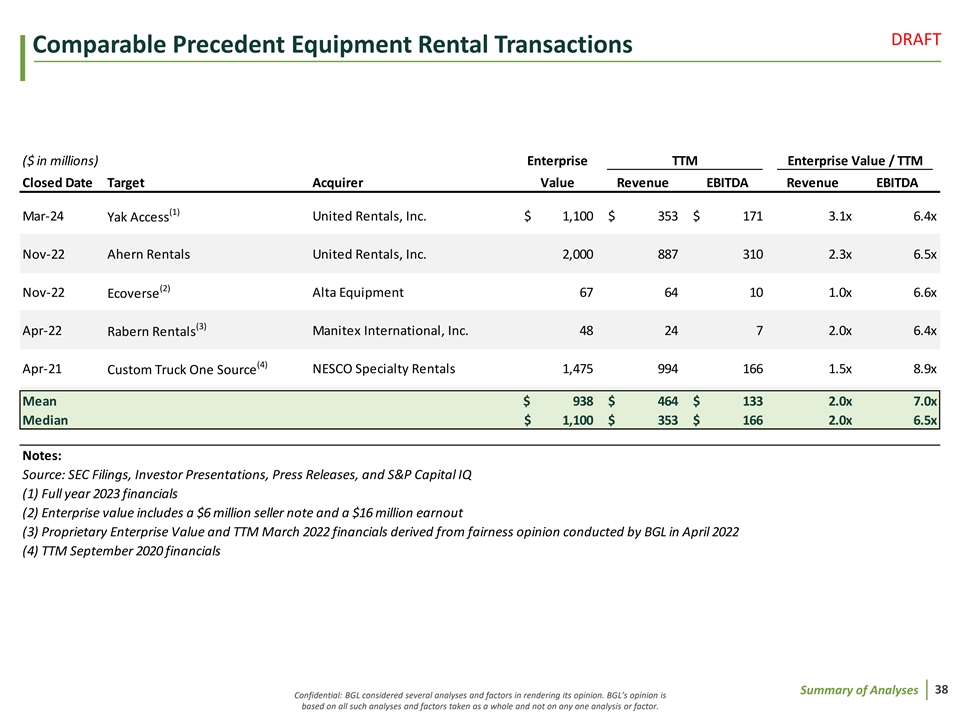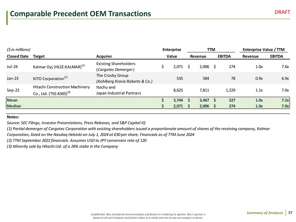 可比先例OEM交易草案(百万美元)企业TTM企业价值/TTM截止日期目标收购方价值收入EBITDA收入EBITDA收入EBITDA现有股东(1)Jul-24 Kalmar OYJ(HLSE:KALMAR)$ 2,071 $ 2,0 06 $ 274 1.0x 7.6x(Cargotec demerger)The Crosby Group(2)JA-23 53558478 0.9x 6.9x KITO Corporation(Kohlberg Kravis Roberts & Co.)Hitachi Construction Machinery Itochu and Sep-22 8,6257,8111,2291.1x 7.0x(3)Japan Industrial Partners Co.,Ltd.(TSE:6305)均值3美元,744美元3,467美元527美元1.0x 7.2倍中位数2,071美元2,006美元274美元1.0x 7.0x注:资料来源:SEC文件、投资者演示文稿、新闻稿和标普 Capital IQ(1)Cargotec Corporation与现有股东的部分分拆发行了接收公司Kalmar Corporation的按比例数量的股份,该公司于2024年7月1日在纳斯达克赫尔辛基上市,每股价格为30欧元。截至2024年6月TTM的财务(2)TTM 2022年9月财务。假设美元兑日元兑换率为120(3)Hitachi Ltd.出售公司26%股权的少数股权37分析摘要机密:BGLL在发表意见时考虑了几项分析和因素。BGL的意见是基于所有这些分析和因素作为一个整体,而不是基于任何一个分析或因素。