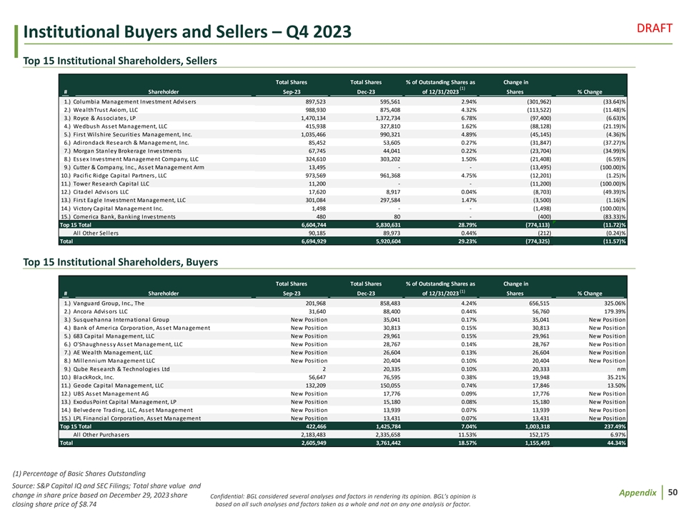 机构买方和卖方草案– 2023年第四季度前15名机构股东、卖方•(1)(1)股份总数占已发行股份百分比变动(1)#股东12/31/2023的Sep-23 Dec-23股份百分比变动1.)COLUMBIA MANAGEMENT投资顾问897,523595,5612。94%(301,962)(33.64)% 2.)WealthTrust Axiom,LLC 988,930875,4084.32%(113,522)(11.48)% 3.)Royce & Associates,LP1,470,1341,372,7346。78%(97,400)(6.63)%4.)Wedbush Asset Management,LLC 415,938327,8101.62%(88,128)(21.19)%5.)First Wilshire Securities Management,Inc. 1,035,466990,3214。89%(45,145)(4.36)%6.)Adirondack Research & Management,Inc. 85,45253,6050.27%(31,847)(37.27)%7.)摩根士丹利 Brokerage Investments 67,74544,0410.22%(23,704)(34.99)% 8.)Essex Investment Management Company,LLC 324,610303,2021。50%(21,408)(6.59)%9.)Cutter & Company,Inc.,Asset Management Arm 13,495--(13,495)(100.00)% 10.)Pacific Ridge Capital Partners,LLC 973,569961,3684。75%(12,201)(1.25)% 11.)Tower Research Capital LLC 11,200---(11,200)(100.00)% 12.)Citadel Advisors LLC 17,6208,9170.04%(8,703)(49.39)% 13.)First Eagle投资管理有限责任公司301,084297,5841。47%(3,500)(1.16)% 14.)Victory Capital Management Inc. 1,498---(1,498)(100.00)% 15.)联信银行银行、银行业投资48080-(400)(83.33)%前15名合计6,604,7445,830,63128.79%(774,113)(11.72)%所有其他卖方90,18589,9730.44%(212)(0.24)%合计6,694,9295,920,60429.23%(774,325)(11.57)%前15名机构股东、买方(1)合计持股占流通股比%为(1)#股东Sep-23 Dec-23 of 12/31/2023 shares %% change 1.)Vanguard Group,Inc.,the 201,968858,4834.444% 56,760179.39% 3.)Susquehanna International Group新职位35,0410。17% 35,041新职位4.)美国银行、资产管理新职位30,8130。15% 30,813新职位5.)683 Capital Management,LLC新职位29,9610。15% 29,961新职位6.)O'Shaughnessy Asset Management,LLC新职位28,7670。14% 28,767新职位7.)AEWealth Management,LLC新职位26,6040.13% 26,604新职位8.)Millennium Management LLC新职位20,4040.10% 20,404新职位9.)Qube Research & Technologies Ltd 220,3350.10% 20,333 nm 10.)贝莱德,Inc. 56,64776,5950.38% 19,94835.21% 11.)Geode Capital Management,LLC 132,209150,0550.74% 17,84613。50% 12.)UBS Asset Management AG新仓17,7760。09% 17,776个新职位13.)ExodusPoint Capital Management,LP新职位15,1800.08% 15,180个新职位14.)Belvedere Trading,LLC,Asset Management新职位13,9390.07% 13,939个新职位15.)LPL投资 Corporation,Asset Management新职位13,4310.07% 13,431个新职位前15名合计422,4661,425,7847.04% 1,003,318237.49%所有其他购买者2,183,4832,335,65811.53% 152,1756。97%合计2,605,9493,761,44218.57% 1,155,49344.34%(1)占已发行基本股份的百分比来源:标普 Capital IQ和SEC备案;股票总价值和50附录基于2023年12月29日的股价变化股票机密:BGL在发表意见时考虑了若干分析和因素。BGL的观点是,基于所有这些分析和因素作为一个整体,而不是基于任何一个分析或因素,收盘股价为8.74美元。资料来源:Capital IQ截至2021年5月12日(1)基于购买时的加权平均每股价格