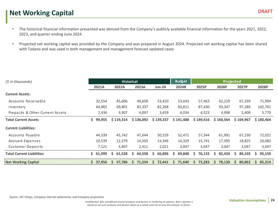 净营运资本草案•所提供的历史财务信息来自公司公开的2021年、2022年、2023年和截至2024年6月的季度的财务信息•预计净营运资本由公司提供,于2024年8月编制。预计净营运资本已与Tadano共享,并用于管理层和管理层预测更新案例预算(千美元)历史预计2021A 2022A 2023A Jun-24 2024B 2025P 2026P 2027P 2028P流动资产:应收账款32,55445,60649,65853,41053,64357,46362,21967,26971,994存货64,96569,80182,33782,26883,81187,43093,34797,289102,701预付和其他流动资产2,4363,9074,0973,6594,0344,5234,9985,4095,770流动资产总额$ 99,955 $ 119,314 $ 136,092 $ 139,337 $ 141,488 $ 149,416 $ 160,564 $ 169,967 $ 180,464流动负债:应付账款44,33945,74247,64450,52952,47157,34461,99167,23072,021应计费用10,53912,37914,50314,34614,32915,74117,39518,82520,082客户存款7,1213,4072,4112,0213,0473,0473,0473,047流动负债总额$ 61,999 $ 61,528 $ 64,558 $ 66,896 $ 69,848 $ 76,133 $ 82,434 $ 89,103 $ 95,150净营运资本$ 37,956 $ 57786美元71,534美元72,441美元71,640美元73,283美元78,130美元80,863美元85,314资料来源:SEC文件、公司内部声明和公司预测24估值假设保密:BGL在发表意见时考虑了几项分析和因素。BGL的意见是基于所有这些分析和因素作为一个整体,而不是基于任何一个分析或因素。