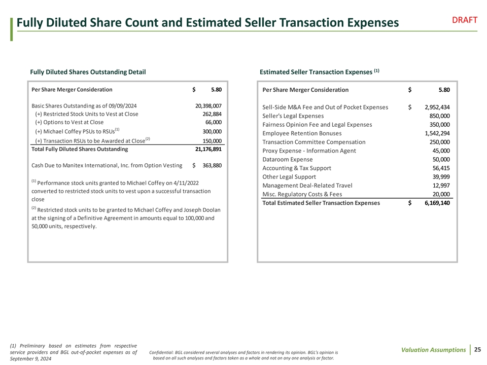 完全稀释股份数量和估计卖方交易费用草案(1)完全稀释已发行股份详情估计卖方交易费用每股合并对价5美元。每股80合并对价5.80美元截至2024年9月9日已发行的基本股份20,398,007卖方并购费和自付费用2,952,434美元(+)限制性股票单位收盘时归属262,884卖方法律费用850,000(+)期权收盘时归属66,000公平意见费和法律费用350,000(1)(+)Michael Coffey PSU至RSU 300,000员工保留奖金1,542,294(2)(+)交易RSU收盘时将授予150,000交易委员会薪酬250,000已发行完全稀释股份总数21,176,891代理费用-信息代理45,000 Dataroom费用50,000现金应付摩尼综合机械,Inc. from Option vesting $ 363,880 accounting & tax support 56,415 other legal support 39,999(1)performance stock units granted to Michael Coffey on 4/11/2022 management deal-related travel 12,997 converted to restricted stock units to vesting on a successful transac监管成本和费用20,000接近估计卖方交易费用总额6,169,140美元(2)在签署最终协议时将授予Michael Coffey和Joseph Doolan的限制性股票单位,金额分别等于100,000和50,000单位。(1)初步基于各自25家估值假设服务提供商的估计和BGL截至机密的自付费用:BGL在发表意见时考虑了几项分析和因素。BGL的意见是基于所有这些分析和因素作为一个整体,而不是基于任何一个分析或因素。2024年9月9日