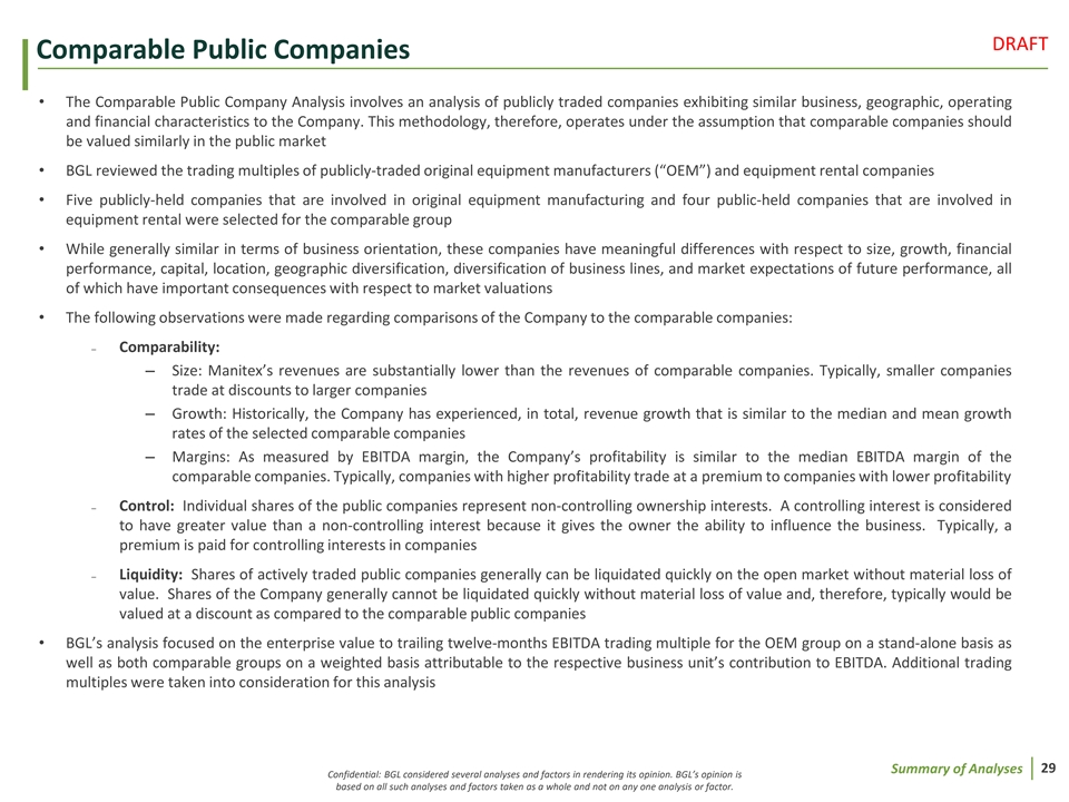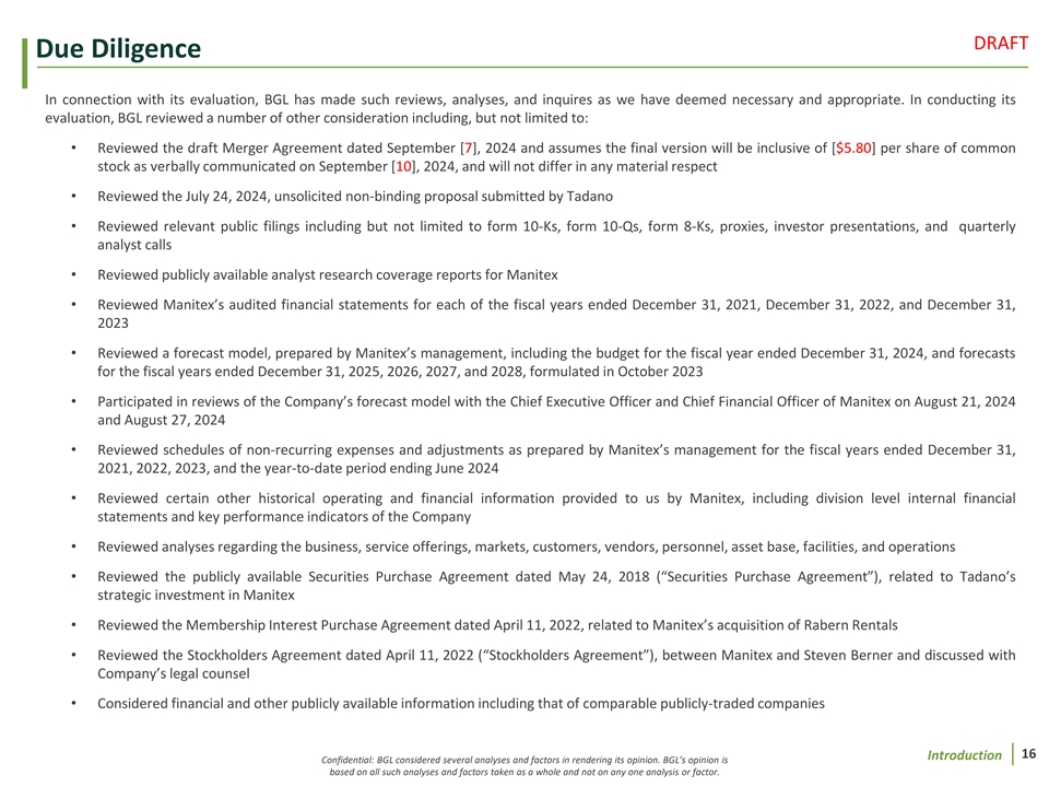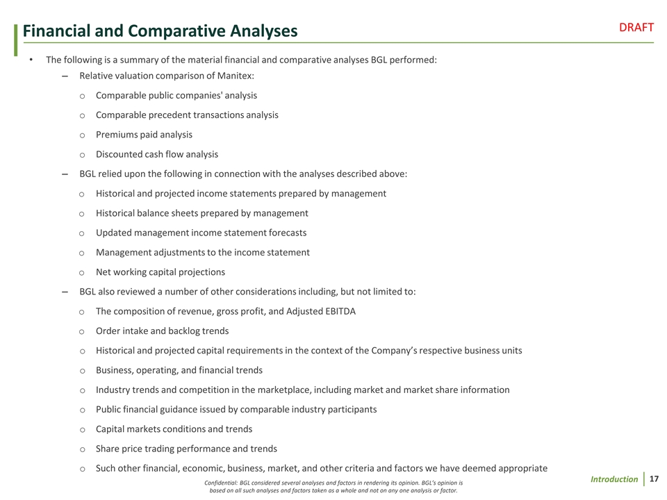 BGL就其评估进行了尽职调查,并作出了我们认为必要和适当的审查、分析和询问。在进行评估时,BGLL审查了其他一些考虑因素,包括但不限于:•审查了日期为2024年9月[ 7日]的合并协议草案,并假设最终版本将包括2024年9月[ 10日]口头传达的每股普通股[ 5.80美元],并且在任何重大方面都不会有差异•审查了Tadano于2024年7月24日提交的主动非约束性提案•审查了相关公开文件,包括但不限于表格10-K、表格10-Q、表格8-K、代理、投资者陈述,和季度分析师电话会议•审查了Manitex公开的分析师研究覆盖报告•审查了Manitex截至2021年12月31日、2022年12月31日和2023年12月31日的每个财政年度的经审计财务报表•审查了由Manitex管理层编制的预测模型,包括截至2024年12月31日的财政年度的预算,以及于2023年10月制定的截至2025年12月31日、2026年、2027年和2028年12月31日的财政年度的预测•于8月21日与Manitex的首席执行官和首席财务官一起参与了公司预测模型的审查,2024年和2024年8月27日•审查了Manitex管理层为截至2021年12月31日、2022年和2023年12月31日的财政年度以及截至2024年6月的年初至今期间编制的非经常性费用和调整时间表•审查了Manitex提供给我们的某些其他历史经营和财务信息,包括部门级别的内部财务报表和公司的关键业绩指标•审查了有关业务、服务产品、市场、客户、供应商、人员、资产基础、设施和运营的分析•审查了日期为2018年5月24日的公开的证券购买协议(“证券购买协议”),与Tadano对Manitex的战略投资有关•审查了日期为2022年4月11日的会员权益购买协议,与Manitex收购Rabern Rentals有关•审查了Manitex与Steven Berner于2022年4月11日签署的股东协议(“股东协议”),并与公司的法律顾问进行了讨论•考虑了财务和其他可公开获得的信息,包括可比上市公司的信息16简介机密:BGL在发表意见时考虑了几项分析和因素。BGL的意见是基于所有这些分析和因素作为一个整体,而不是基于任何一个分析或因素。