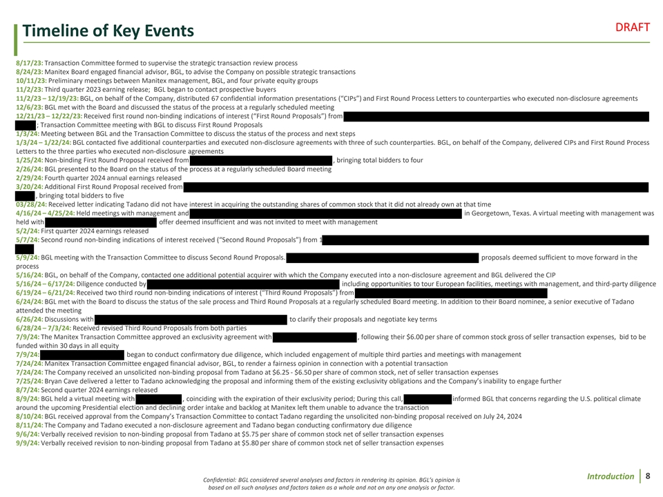 关键事件时间表草案8/17/23:为监督战略交易审查过程而成立的交易委员会8/24/23:Manitex董事会聘请财务顾问BGLL就可能的战略交易向公司提供建议10/11/23:Manitex管理层、BGLL和四家私募股权集团的初步会议11/2/23:2023年第三季度收益发布;BGLL开始与潜在买家接触11/2/23 – 12/19/23:BGLL代表公司,向执行保密协议的对手方分发了67份机密信息演示(“CIPs”)和第一轮流程信函12/6/23:BGLL与董事会举行会议,并在定期安排的会议上讨论了流程状态12/21/23 – 12/22/23:收到来自的第一轮非约束性利益指示(“第一轮提案”);交易委员会与BGLL举行会议,讨论第一轮提案1/3/24:BGLL与交易委员会举行会议,讨论流程状态和后续步骤1/3/24 – 1/22/24:BGLL联系了另外五个对手方,并与其中三个此类对手方执行了保密协议。BGL代表公司向执行保密协议的三方递交了CIPs和第一轮流程信函1/25/24:收到的不具约束力的第一轮提案,使投标人总数达到四个2/26/24:BGL在定期安排的董事会会议上向董事会提交了流程状态2/29/24:2024年第四季度年度收益发布3/20/24:收到的额外第一轮提案,使投标总人数达到5人03/28/24:收到信函,表明Tadano没有兴趣收购当时尚未拥有的已发行普通股股票4/16/24 – 4/25/24:与管理层和在德克萨斯州乔治敦举行会议。与管理层举行了虚拟会议,报价被认为不足,未被邀请与管理层会面5/2/24:2024年第一季度收益发布5/7/24:从15/9/24起收到的第二轮非约束性意向指示(“第二轮提案”):BGLL与交易委员会举行会议,讨论第二轮提案。被认为足以在该过程中向前推进的提案5/16/24:BGLL代表公司联系了另一家潜在收购方,公司与其签署了保密协议,BGLL交付了CIP 5/16/24 – 6/17/24:通过包括参观欧洲设施的机会进行勤奋,与管理层的会议,以及第三方尽职调查6/19/24 – 6/21/24:从6/24/24起收到两个第三轮非约束性利益指示(“第三轮提案”):BGLL与董事会举行会议,在定期安排的董事会会议上讨论出售过程的状态和第三轮提案。除了他们的董事会提名人,Tadano的一位高级管理人员参加了会议6/26/24:与之进行讨论以澄清他们的提案并就关键条款进行谈判6/28/24 – 7/3/24:收到双方修订的第三轮提案7/9/24:Manitex交易委员会批准了一项排他性协议,在其每股普通股总额为6.00美元的卖方交易费用后,出价在30天内为所有股权提供资金7/9/24:开始进行确认性尽职调查,其中包括聘请多个第三方并与管理层会面7/24/24:Manitex交易委员会聘请财务顾问、BGL,就潜在交易提出公平意见7/24/24:公司收到Tadano主动提出的非约束性提议,价格为每股普通股6.25-6.50美元,扣除卖方交易费用7/25/24:Bryan Cave向Tadano递交了一封信,承认该提议,并告知他们现有的排他性义务和公司无法进一步参与8/7/24:2024年第二季度收益发布8/9/24:BGLL举行了一次虚拟会议,恰逢其排他性期限届满;在此次电话会议期间,告知BGL,围绕即将举行的总统大选的美国政治气候以及Manitex订单接收和积压下降的担忧使他们无法推进交易8/10/24:BGL获得公司交易委员会的批准,可就7月24日收到的主动非约束性提案与Tadano进行接触, 20248/11/24:公司与Tadano执行保密协议,Tadano开始进行确认性尽职调查9/6/24:口头收到Tadano对非约束性提案的修订,每股普通股5.75美元,扣除卖方交易费用9/9/24:口头收到Tadano对非约束性提案的修订,每股普通股5.80美元,扣除卖方交易费用8简介机密:BGL在发表意见时考虑了几项分析和因素。BGL的意见是基于所有这些分析和因素作为一个整体,而不是基于任何一个分析或因素。