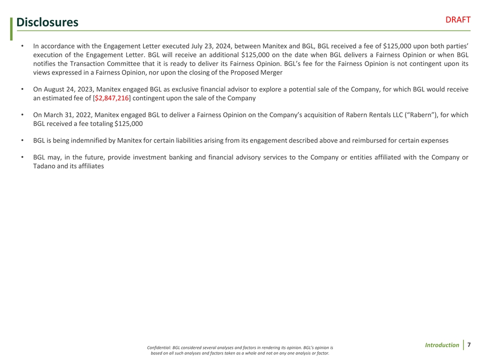 披露草案•根据Manitex和BGL于2024年7月23日签署的聘书,BGL在双方签署聘书时收到了125,000美元的费用。BGLL将在BGLL提交公平意见之日或BGLL通知交易委员会准备提交公平意见之日获得额外12.5万美元。BGL对公平意见的费用不取决于其在公平意见中表达的观点,也不取决于拟议合并的完成• 2023年8月24日,Manitex聘请BGL作为独家财务顾问探索公司的潜在出售,BGL将因出售公司而获得估计费用[ 2,847,216美元] • 2022年3月31日,Manitex聘请BGL就公司收购Rabern Rentals LLC(“Rabern”)提供公平意见,BGL为此收到了总额为125,000美元的费用• BGL正由Manitex就其上述业务产生的某些负债进行赔偿,并偿还某些费用• BGL未来可能会向公司或与公司或Tadano及其关联公司有关联的实体提供投资银行和财务咨询服务7简介机密:BGL在发表意见时考虑了几项分析和因素。BGL的意见是基于所有这些分析和因素作为一个整体,而不是基于任何一个分析或因素。