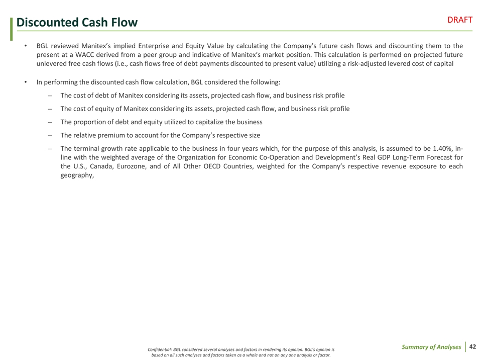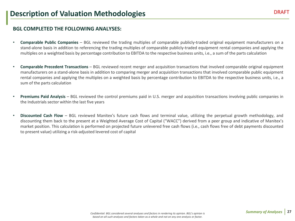 估值方法说明草案BGL完成了以下分析:•可比上市公司– BGL除了参考可比上市设备租赁公司的交易倍数并按对各自业务部门的EBITDA贡献百分比在加权基础上应用该倍数外,还单独审查了可比上市原始设备制造商的交易倍数,即,部分计算的总和•可比先例交易– BGL审查了近期涉及可比原始设备制造商的单独并购交易,此外还比较了涉及可比公共设备租赁公司的并购交易,并按对各自业务部门的EBITDA贡献百分比加权应用了倍数,即,各部分的总和计算•支付的溢价分析– BGL审查了过去五年内在涉及工业部门上市公司的美国并购交易中支付的控制权溢价•折现现金流– BGL审查了Manitex的未来现金流和终值,采用永续增长方法,并以从同行集团得出并表明Manitex市场地位的加权平均资本成本(“WACC”)将其折现回当前。这种计算是利用风险调整后的杠杆资本成本对预计的未来无杠杆自由现金流(即没有债务支付的现金流折现为现值)进行的27分析摘要机密:BGL在发表意见时考虑了几项分析和因素。BGL的意见是基于所有这些分析和因素作为一个整体,而不是基于任何一个分析或因素。