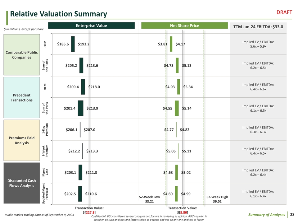 相对估值摘要草案企业价值净股价TTM Jun-24 EBITDA:33.0美元百万美元,每股隐含EV/EBITDA除外:$ 185.6 $ 193.2 $ 3.81 $ 4.17 5.6x – 5.9x可比上市公司隐含EV/EBITDA:$ 205.2 $ 213.6 $ 4.73 $ 5.13 6.2x – 6.5x隐含EV/EBITDA:$ 209.4 $ 218.0 $ 4.93 $ 5.34 6.4x – 6.6x先例交易隐含EV/EBITDA:$ 201.4 $ 213.9 $ 4.55 $ 5.14 6.1x – 6.5x隐含EV/EBITDA:$ 206.1 $ 207.0 $ 4.77 $ 4.8 26.3x – 6.3x溢价已付分析隐含EV/EBITDA:$ 212.2 $ 213.3 $ 5.06 $ 5.1 16.4x – 6.5x隐含EV/EBITDA:$ 203.1 $ 211.3 $ 4.63 $ 5.0 26.2x – 6.66.1x – 6.4x 52周低位52周高位$ 3.21 $ 9.02成交金额:成交金额:$ [ 227.8 ] $ [ 5.80 ] 28截至2024年9月9日的公开市场交易数据分析摘要机密:BGL在发表意见时考虑了几项分析和因素。BGL的意见是基于所有这些分析和因素作为一个整体,而不是基于任何一个分析或因素。更新MGMT MGMT1周1天主机厂预测Case premium premium the parts the parts the parts