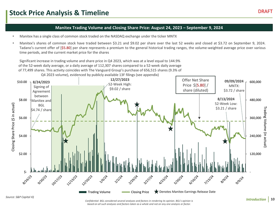 交易量(实际)股价分析草案&时间线Manitex交易量和收盘价:2023年8月24日– 2024年9月9日• Manitex在纳斯达克交易所交易的单一类别普通股,股票代码为MNTX • Manitex的普通股股票在过去52周的交易价格在每股3.21美元至9.02美元之间,2024年9月9日收于3.72美元。Tadano目前每股[ 5.80美元]的报价较一般历史交易区间、不同时间段的成交量加权平均价格和股票当前市场价格有溢价2023年第四季度的交易量和股价显着增加,处于相当于52周日均水平的144.9%的水平,即日均112,307股,而52周的日均水平为77,499股。此活动恰逢领航集团购买656,515股(占2023年第四季度交易量的9.3%),公开的13F文件证明了这一点(见附录)12/27/2023要约净股09/09/2024 $ 10.00 600,0008/24/202352周最高价:价格$ [ 5.80 ]/MNTX:签署9.02美元/股(稀释后)$ 3.72/股的协议,介于8/13/2024 $ 8.00480,000 Manitex和52周最低价:BGL3.21美元/股$ 4.74/股$ 6.00360,000 $ 4.00240,000 $ 2.00 120,000 $--交易量收盘价表示Manitex收益发布日期来源:标普 Capital IQ 10简介机密:BGLL考虑了几个BGL的意见是基于所有这些分析和因素作为一个整体,而不是基于任何一个分析或因素。收盘价(美元实际)