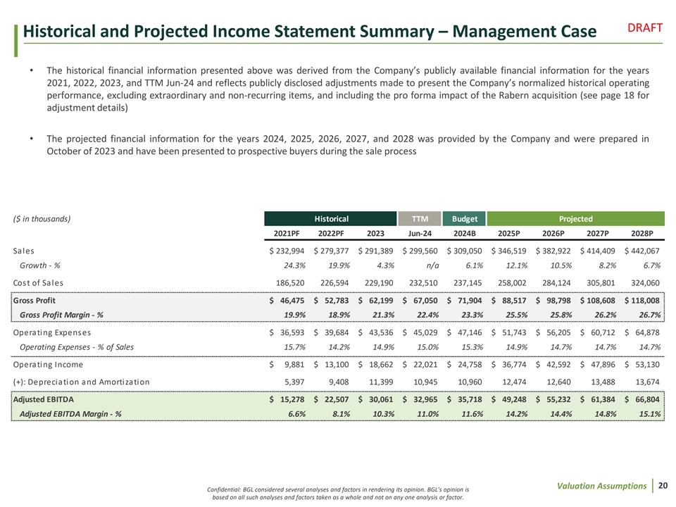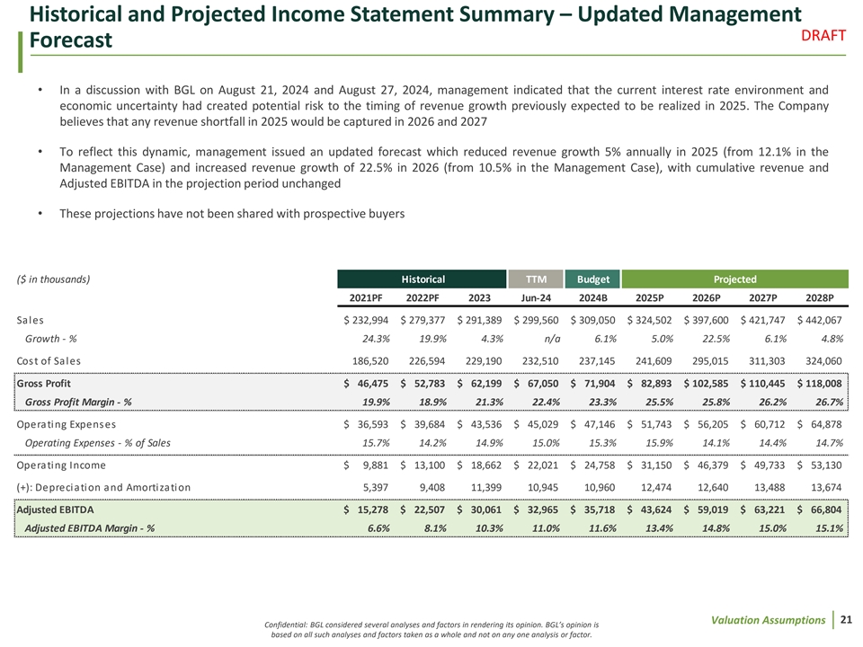 历史和预计损益表摘要–更新了管理层草案预测•在2024年8月21日和2024年8月27日与BGLL的讨论中,管理层表示,当前的利率环境和经济不确定性对此前预计在2025年实现的收入增长时间造成了潜在风险。该公司认为,2025年的任何收入短缺都将在2026年和2027年得到反映•为反映这一动态,管理层发布了更新的预测,将2025年的收入增长率(管理案例中为12.1%)每年降低5%,将2026年的收入增长率提高22.5%(管理案例中为10.5%),预测期内的累计收入和调整后EBITDA保持不变•这些预测尚未与潜在买家分享(单位:千美元)历史TTM预算预计2021PF 2022PF 2023Jun-24 2024B 2025P 2026P 2027P 2028P销售额232,994美元279,377美元291美元,389 $ 299,560 $ 309,050 $ 324,502 $ 397,600 $ 421,747 $ 442,067增长-% 24.3% 19.9% 4.3%不适用6.1% 5.0% 22.5% 6.1% 4.8%销售成本186,520226,594229,190232,510237,145241,609295,015311,303324,060毛利润$ 46,475 $ 52,783 $ 62,199 $ 67,050 $ 71,904 $ 82,893 $ 102,585 $ 110,445 $ 118,008毛利率-% 19.9% 18.9% 21.3% 22.4% 23.3% 25.5% 25.8% 26.2% 26.7%营业费用$ 36,593 $ 39,684 $ 43,536 $ 45,029 $ 47,146 $ 51,743 $ 56,205 $ 60,712 $ 64,878营业费用-占销售额百分比15.7% 14.2% 14.9% 15.0% 15.3% 15.9% 14.1% 14.4% 14.7%营业收入$ 9,881 $ 13,100 $ 18,662 $ 22,021 $ 24,758 $ 31,150 $ 46,379 $ 49,733 $ 53,130(+):折旧和摊销5,3979,40811,39910,94510,96012,47412,64013,48813,674调整后EBITDA 15美元,278美元22,507美元30,061美元32,965美元35,718美元43,624美元59,019美元63,221美元66,804美元调整后EBITDA利润率-% 6.6% 8.1% 10.3% 11.0% 11.6% 13.4% 14.8% 15.0% 15.1% 21估值假设保密:BGLL在发表意见时考虑了几项分析和因素。BGL的意见是基于所有这些分析和因素作为一个整体,而不是基于任何一个分析或因素。