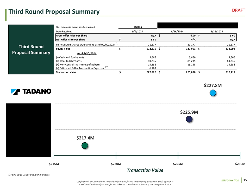 第三轮提案摘要草案(千美元,每股价值除外)Tadano Date收到9/9/20246/26/20246/26/2024每股发售价毛额N/A $ 6.00 $ 5.60每股发售价净额$ 5.80 N/A N/A(1)截至09/09/202421,17721,17721,177第三轮股权价值$ 122,826 $ 127,061 $ 118,591截至2024年6月30日的建议摘要(-)现金和等价物5,6665,6665,666(+)总负债89,23589,23589,235(+)非控股权益拉本15,25815,25815,258(1)(+)估计卖方交易费用6,169交易价值227,822美元225,888美元217,417美元227.8m美元225.9m美元217.4m美元21500万美元22000万美元22500万美元23000万美元交易价值(1)更多详情见第25页15简介机密:BGLL在发表意见时考虑了几项分析和因素。BGL的意见是基于所有这些分析和因素作为一个整体,而不是基于任何一个分析或因素。